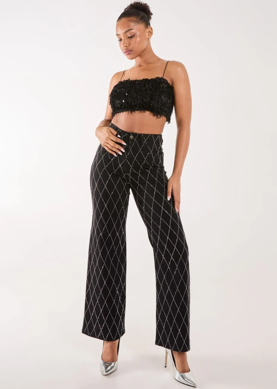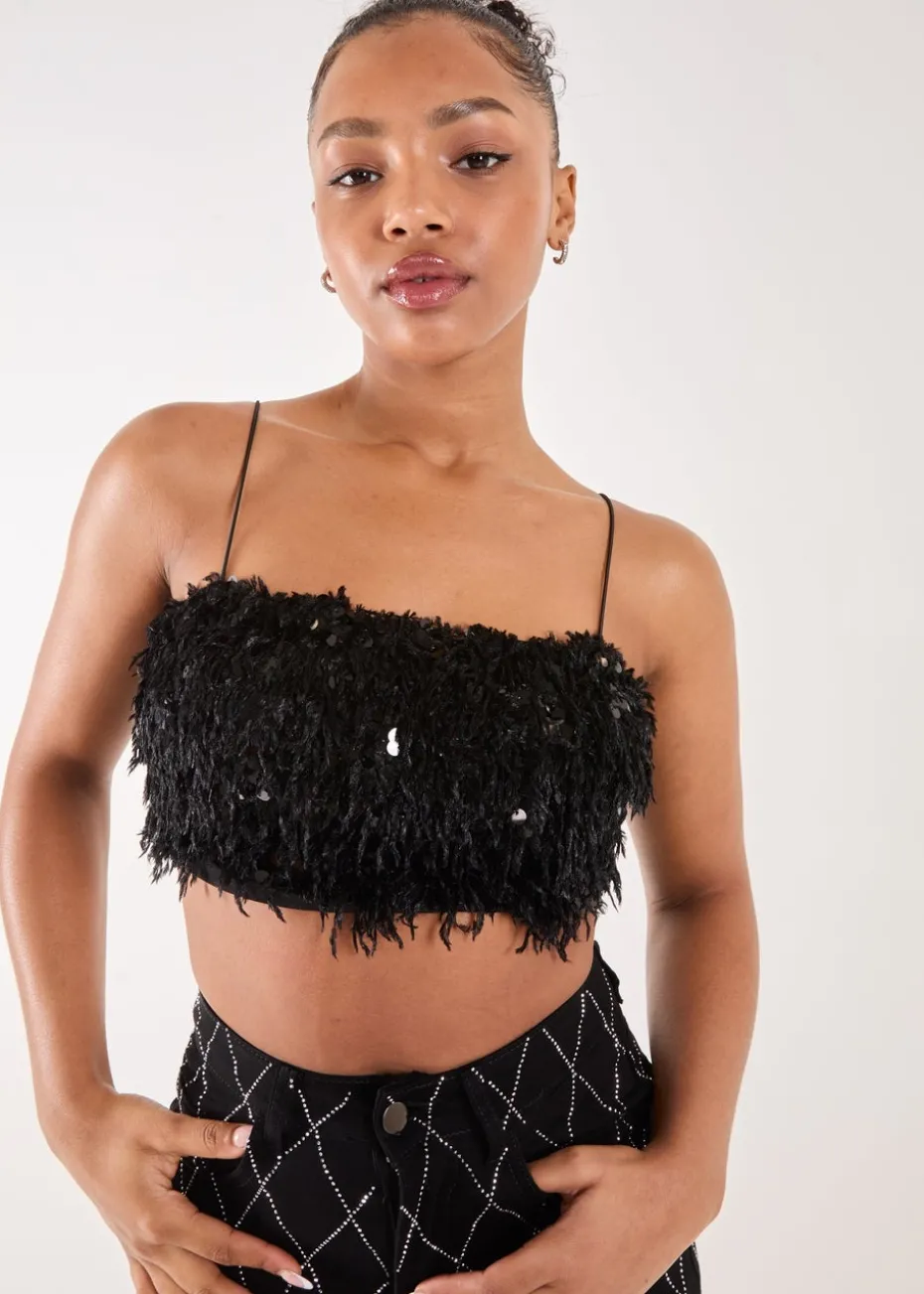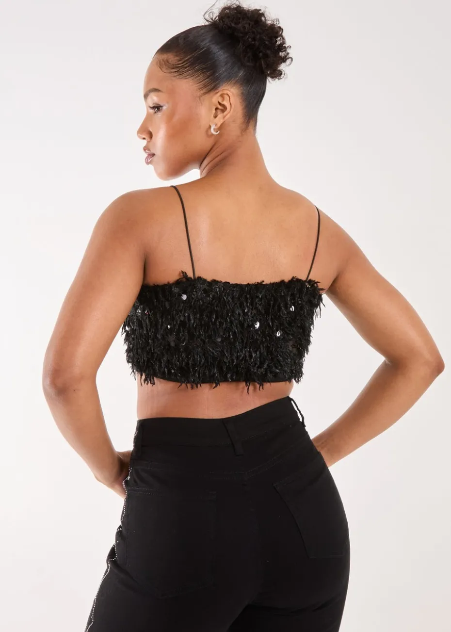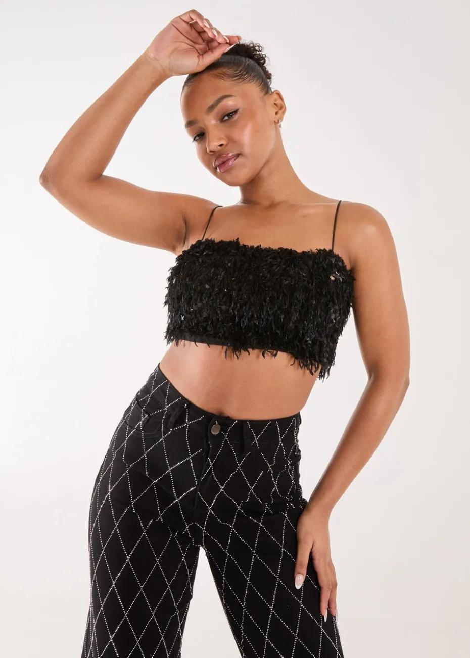 Elevate your partywear looks with this dreamy feather sequin cami top. This crop top is an absolute statement piece you want in your wardrobe now. Style it with our Diamante Jeans for a killer look or a leather mini skirt for a fun outfit.