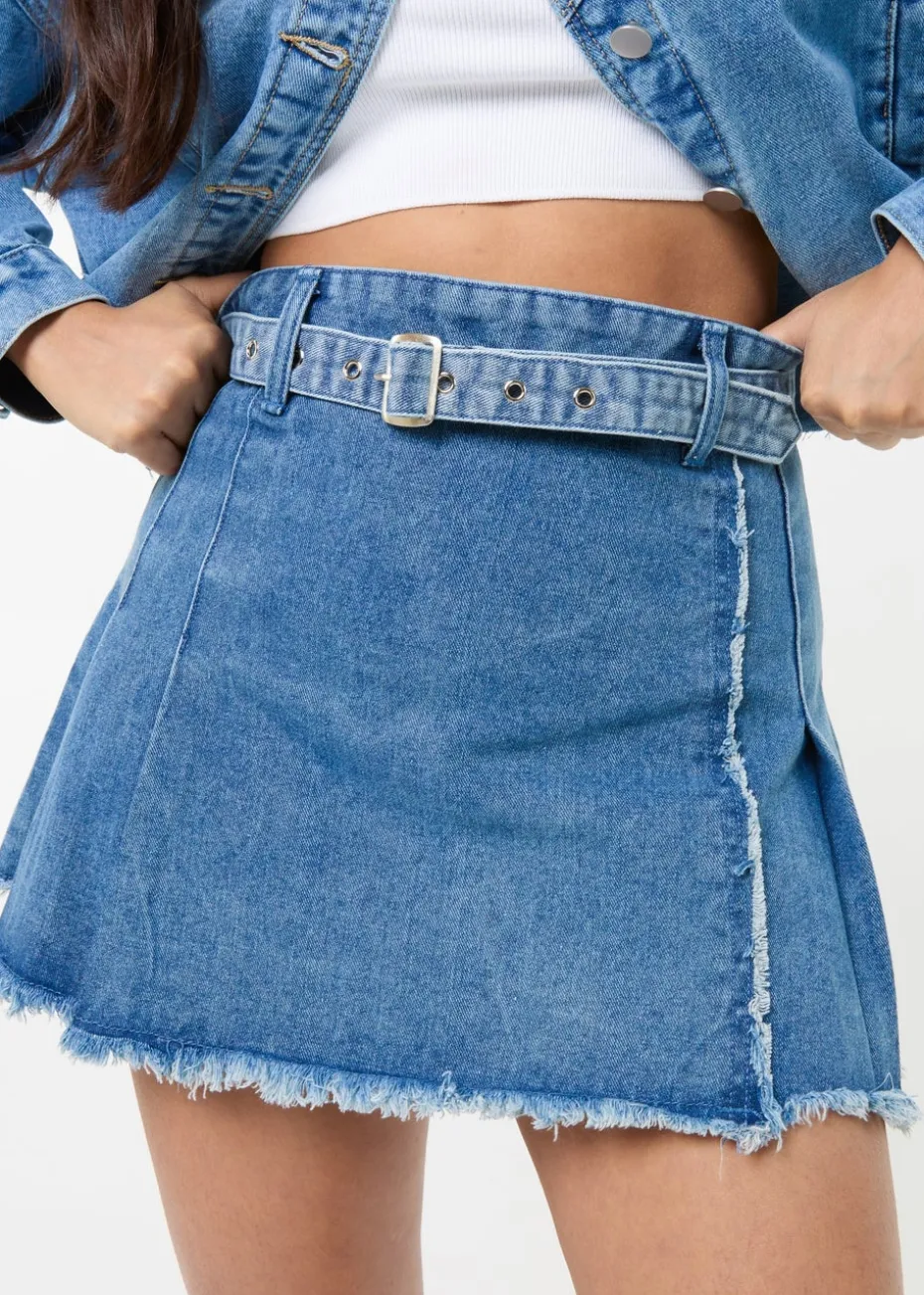 Swish in your new fave denim mini skirt. It goes with all transitional ‘fits. We’re loving it by wearing it with boots and a waistcoat.