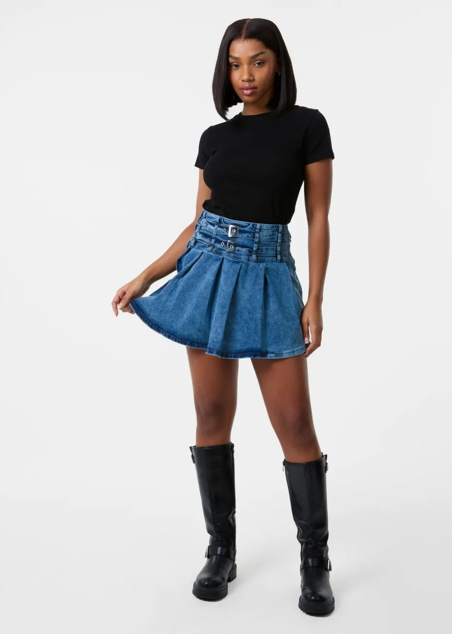 Pink Vanilla Blue Denim Double Belt Pleat Mini Skirt