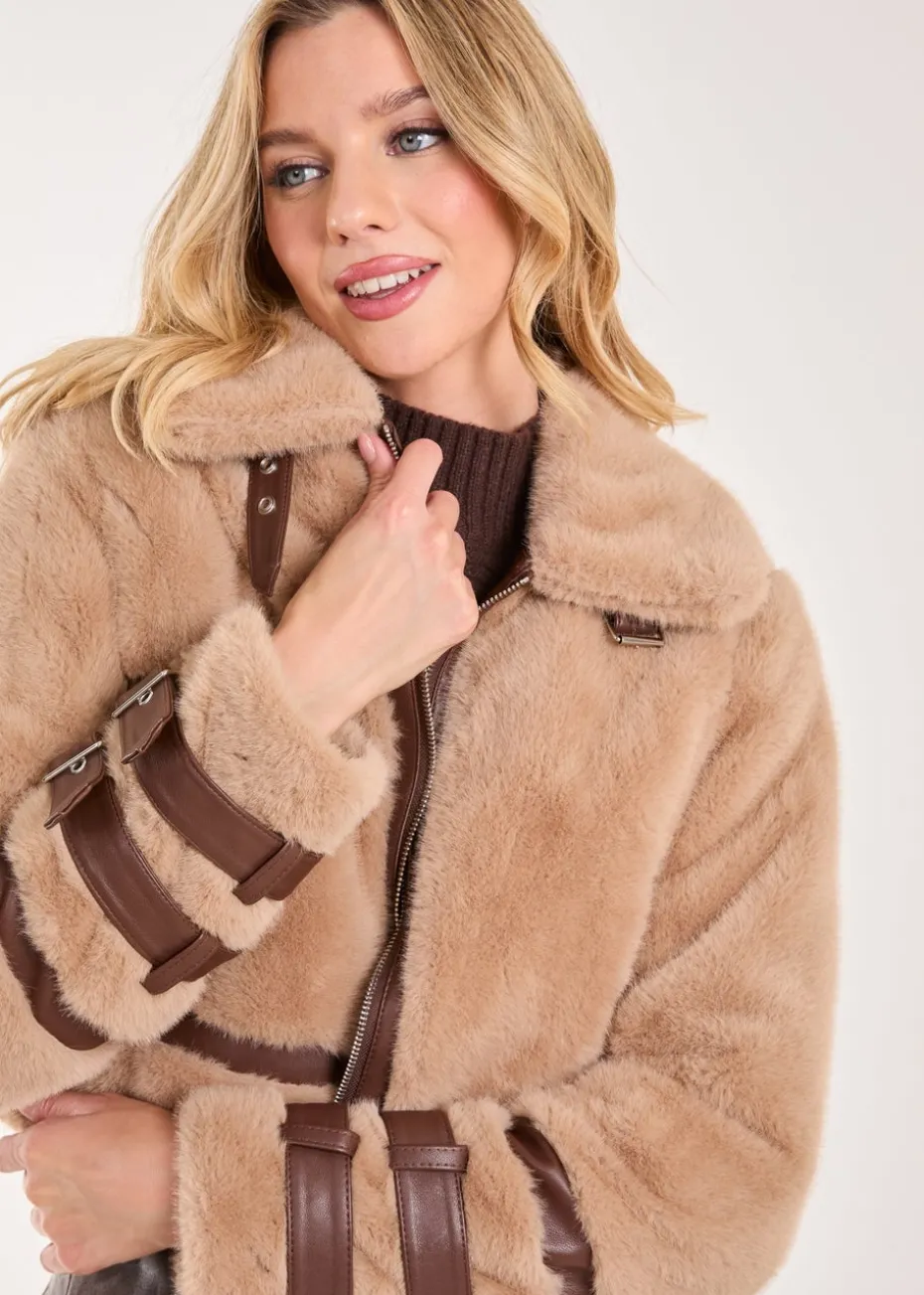 Keep it warm this season with this trendy Fur PU Buckle Detail Coat by Pink Vanilla.