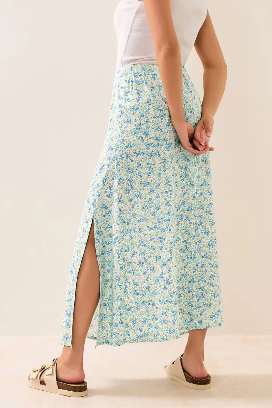 Bloom through summer with this ditsy floral skirt. Made from a comfortable woven fabric, it features an elasticated waistband, a side seam slit and is complete at a midaxi length in a slip-on style. Team with a basic vest top and sandals for your new summertime fave Model is 5’1″ / 155 cm and size UK 6 / EU 34.