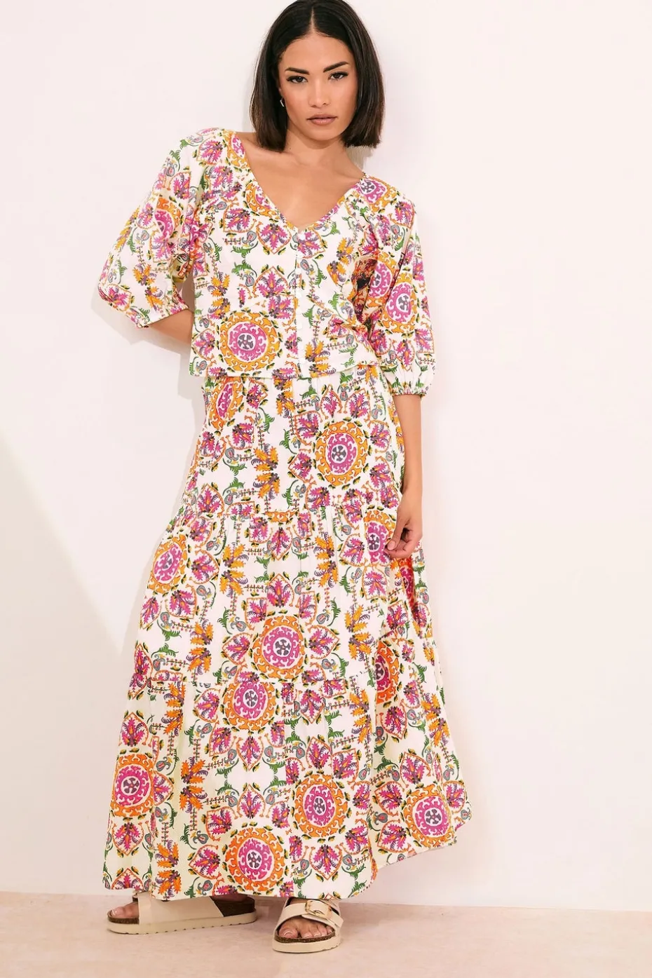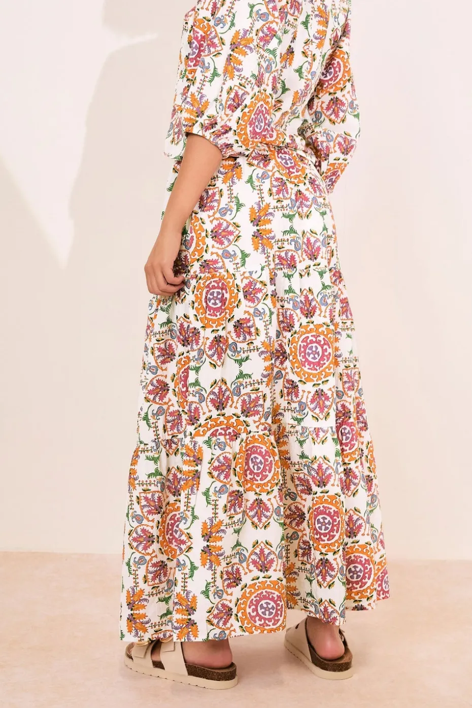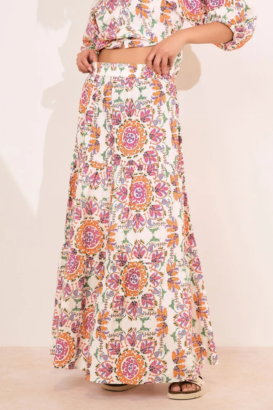 Tap into this seasons boho trend with this abstract skirt. Made from a soft cotton fabric, it features an elasticated waistband and is complete with a tiered style skirt that sits at a maxi length. Rotate with the matching top or a plain bandeau for a piece you can dress up and down Model is 5’1″ / 155 cm and size UK 6 / EU 34.