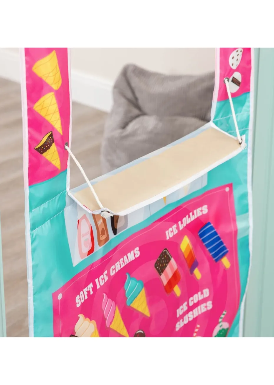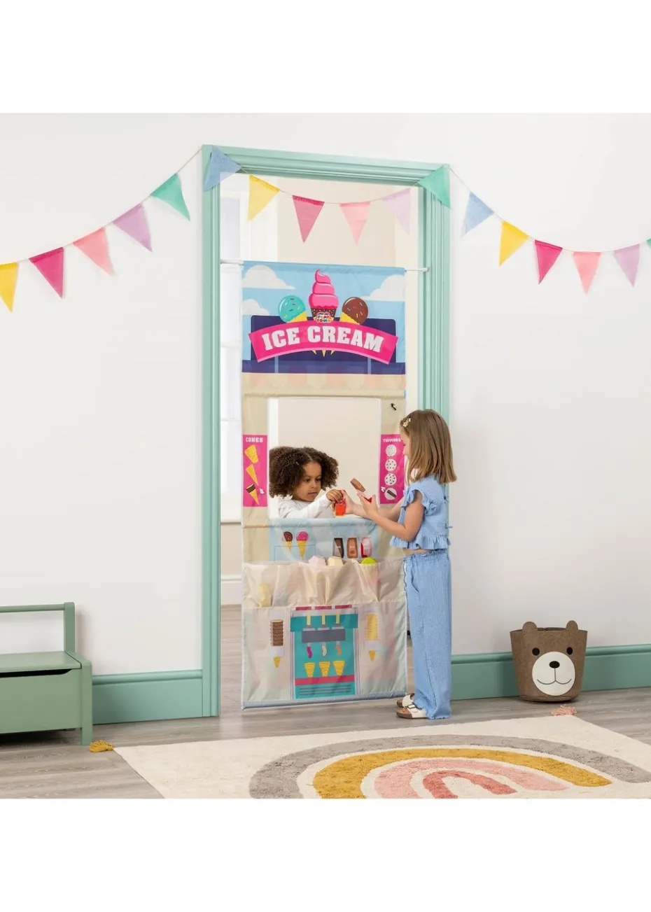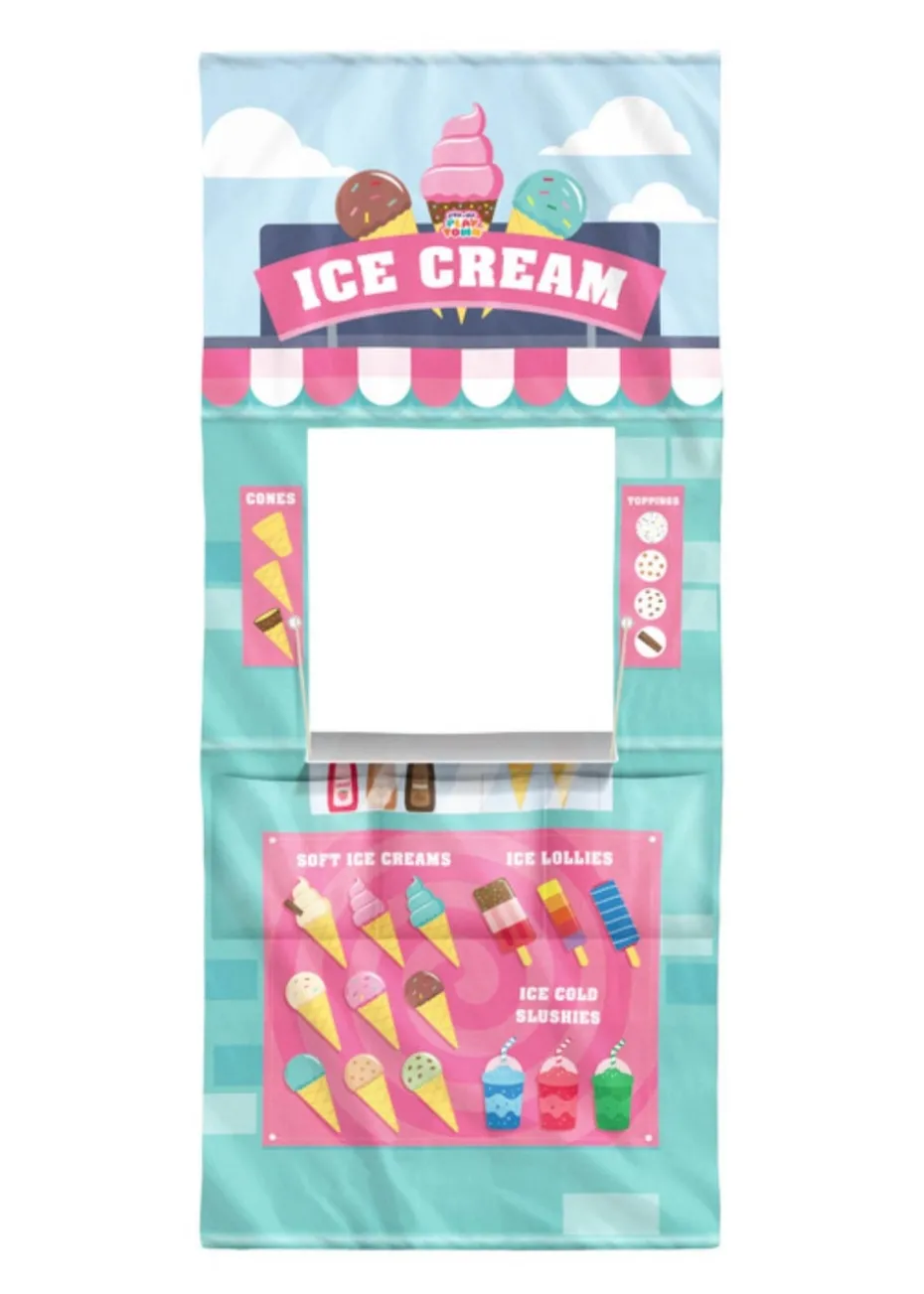 Let imaginations run wild with the Playhouse Magical Ice Cream Shop Role Play Curtain. Transform any door into a whimsical ice cream shop with this role play curtain. With an extendable rod, it easily fits any standard UK door frames, bringing endless role play fun to the home. With two printed card play ice creams and a fold up shelf, the Play Curtain is ideal for encouraging imaginative play for ages 3-8 years. Teach vital skills such as counting within their pretend play with the included play money. When playtime is over, simply remove the rod and roll up the curtain for easy storage.