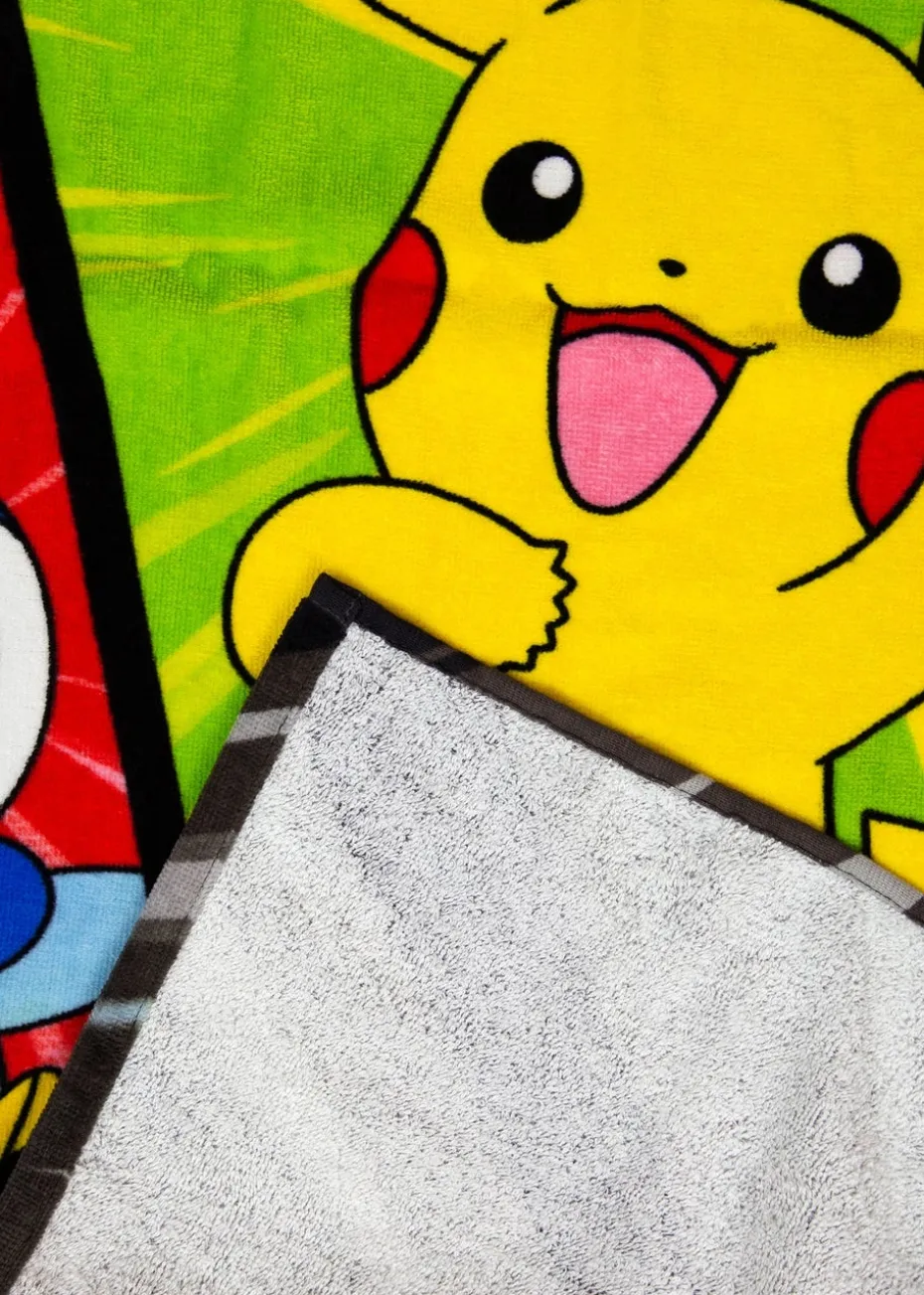 This official Pokemon towel features a large, colourful print of a Pokeball on a black background, with a comic book style panel pattern of Pikachu, Eevee and Piplup on red, green and blue backgrounds. This towel makes for a great gift for any young Pikachu or Pokemon fan, and it can be rolled or folded up compact enough to go in a sports bag to use at swimming lessons, take to school, or to fit in a suitcase.