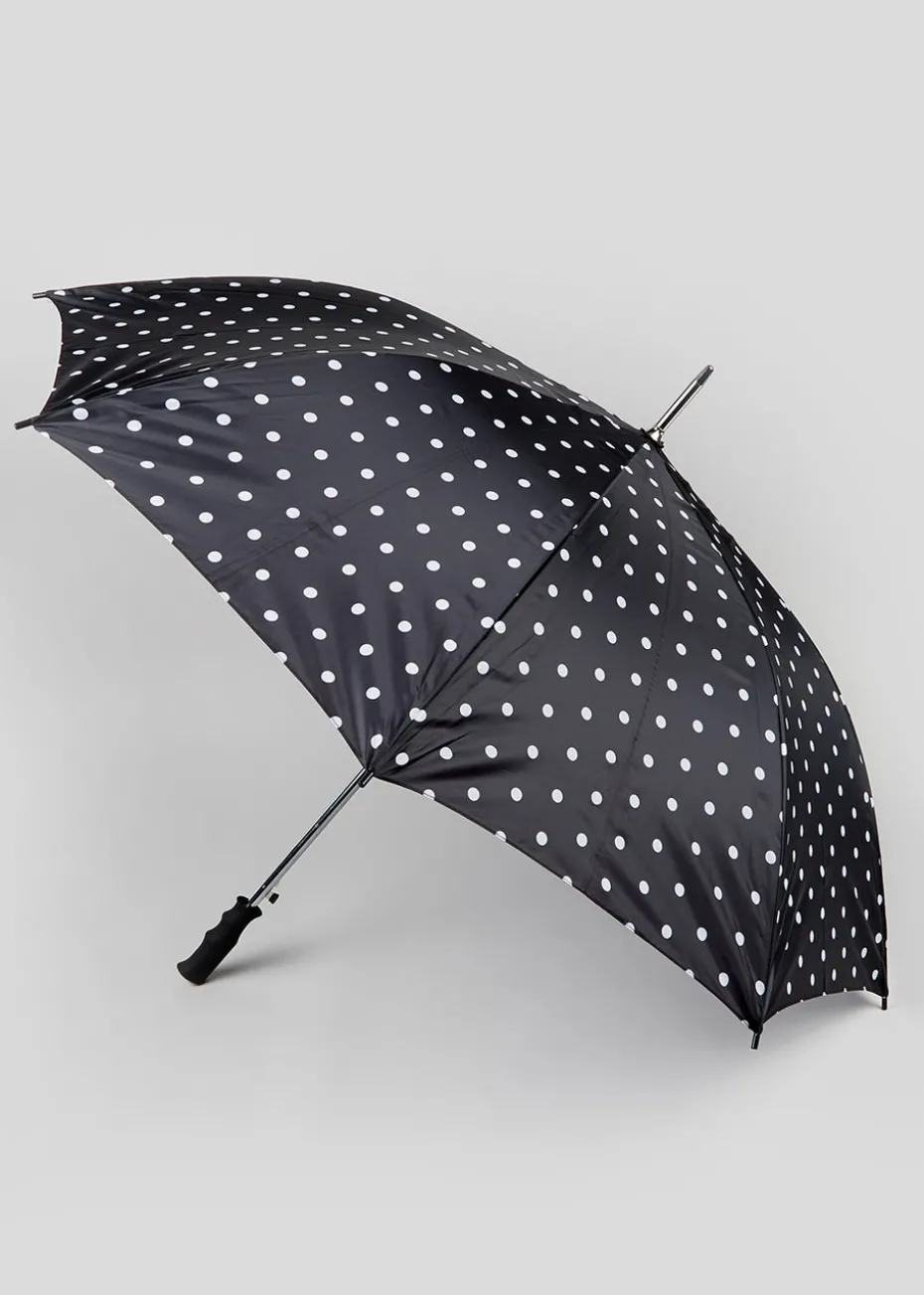 Shield yourself from the downpours with this large golf umbrella, constructed in a simple black polka dot design with easy grip handle. No fuss or frills, just reliable protection from the rain.