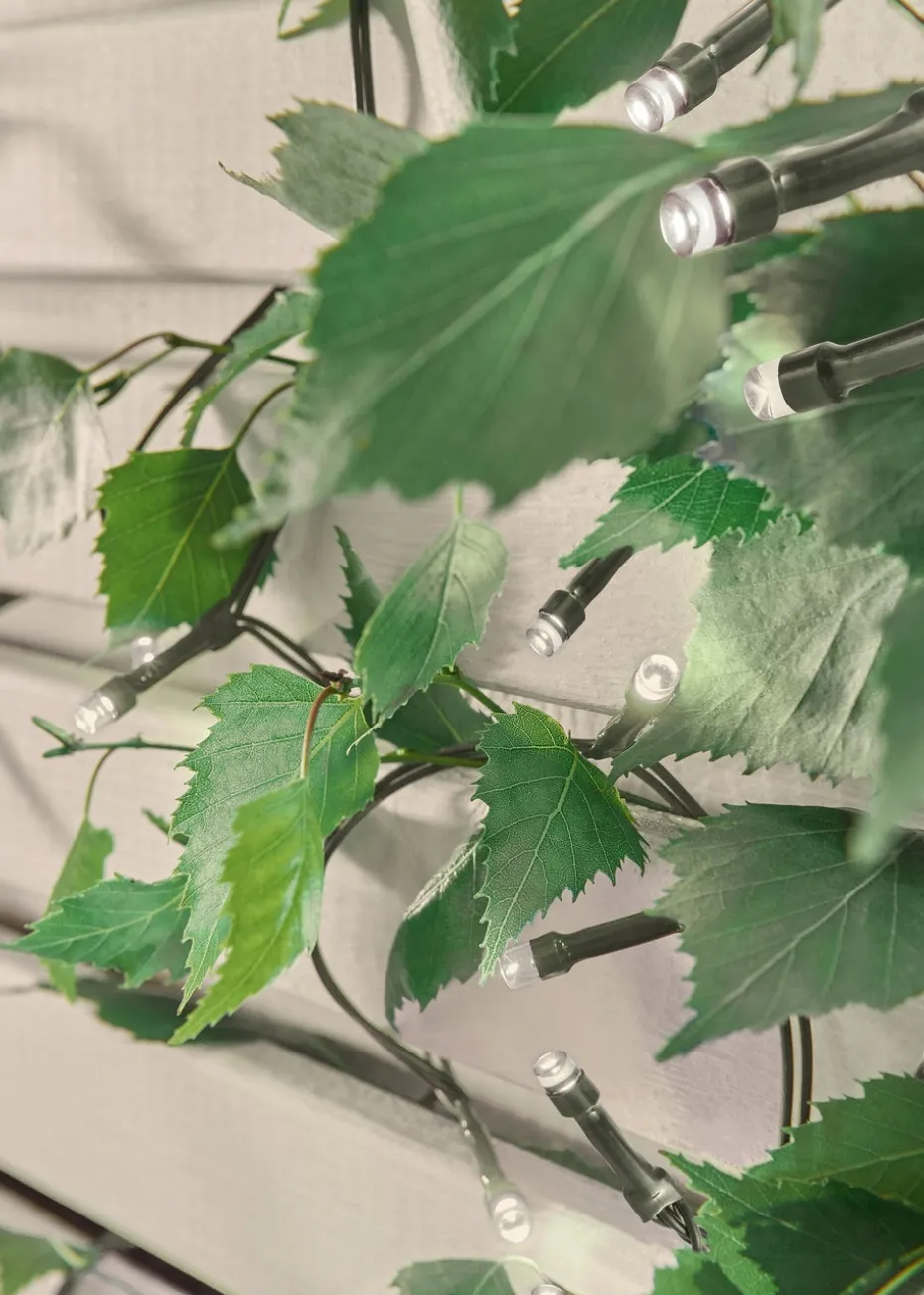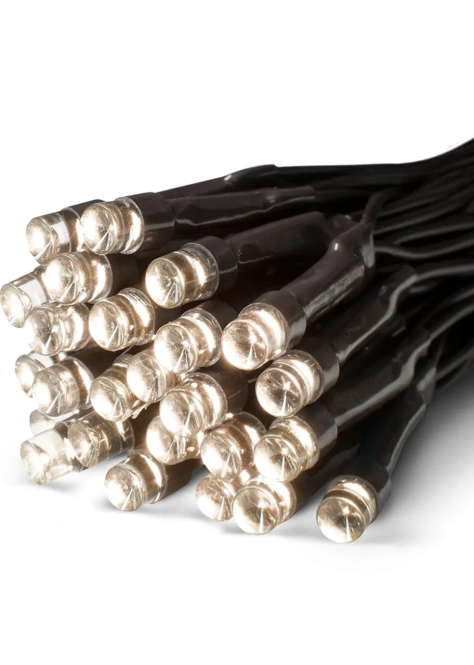 200 warm white battery operated LED string lights with a 15.9m lit length on a green cable with 0.3m lead length to the battery pack. Multi-action with 8 functions. Features a timer function that switched on for 6 hours and off for 18 hours. Suitable for indoor and outdoor use.