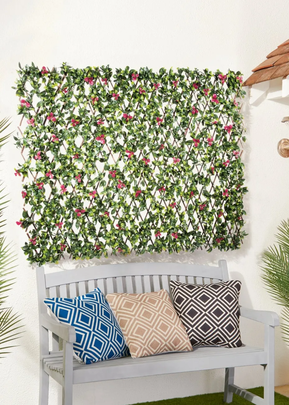 Decorative gardenia trellis with vibrant pink petals and green leaves in mixed shades on a willow frame. Made from weather resistant UV stable plastics it’s lightweight and easy to install, instantly creating a point of interest in the home or garden. Suitable for indoor or outdoor use. When expanded fully measures 130cm x 270cm.
