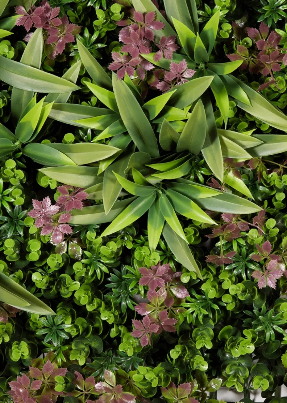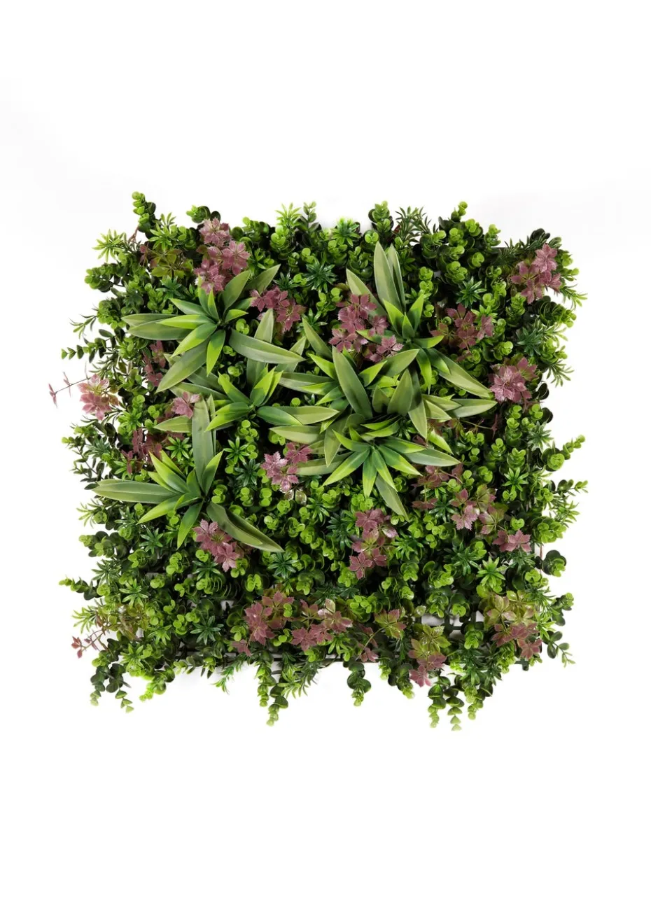 Blush romance artificial living wall with a luscious mixture of green and purple shrubs and grasses. Made from weather resistant UV stable plastics it’s lightweight and easy to install, instantly creating a point of interest in the home or garden. Measures 50cm x 50cm. Suitable for indoor or outdoor use.