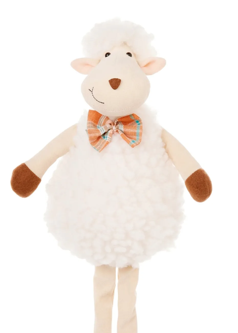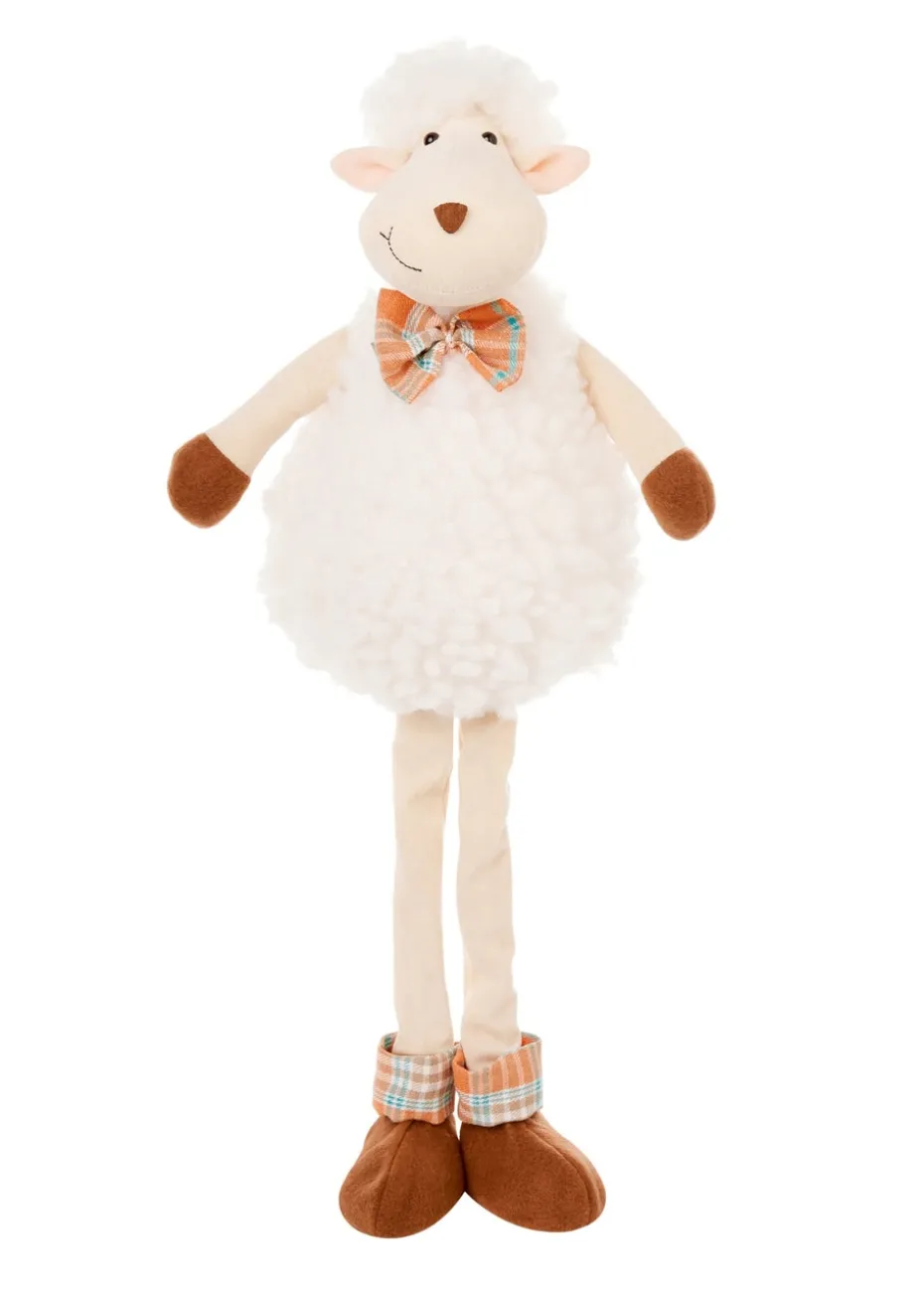 Extendable legs standing woolly sheep plush ornament with super soft wool and a fetching orange and blue bow tie.