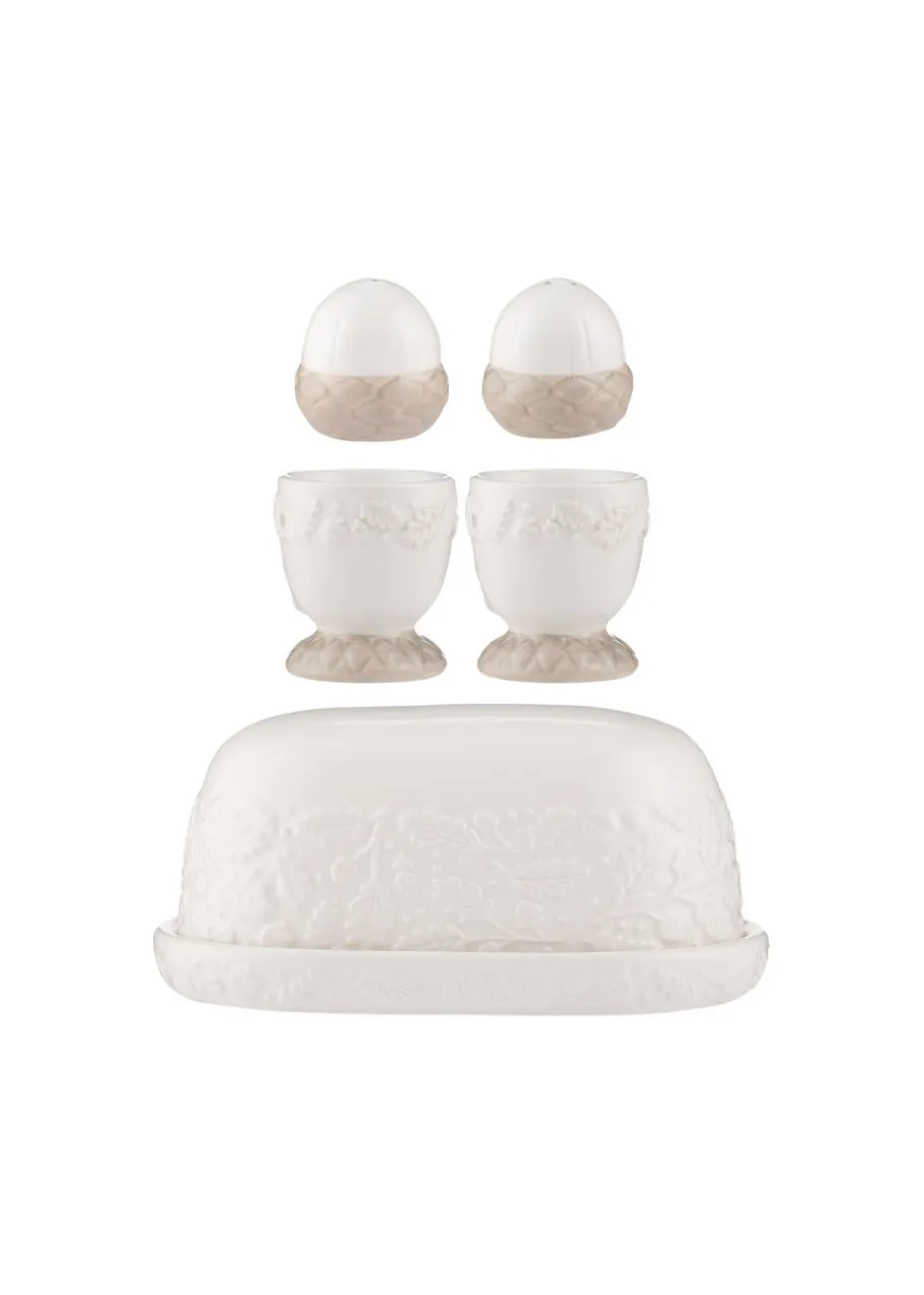 The Acorn set contains everything you need for your breakfast table. This set contains a butter dish, a set of 2 egg cups and a salt and pepper set. Perfect for everyday use, the Price & Kensington Acorn butter dish is ideal for keeping butter fresh. This simple yet stylish butter dish is made from quality ceramic and features a delicately embossed acorn design, finished with a soft cream glaze. Great for holding delicious boiled eggs, the Acorn set of 2 egg cups features a delicate embossed acorn design, finished with a soft cream glaze. Made from durable ceramic, the base of each cup is hand painted in a neutral shade sure to complement any breakfast table. Sure to add some fun to any kitchen table, the Price & Kensington Acorn Salt & Pepper set is the perfect dinner or breakfast time accessory. Made from quality ceramic, the set contains two novelty Acorn shaped shakers with a delicate hand paint finish. The Acorn breakfast set is part of a fully co-ordinating Acorn collection, including ceramic storage and ceramic table top accessories. Inspiring teapots & table tops since 1896, Price & Kensington is a well-known British brand, renowned for quality products. Whilst teapots remain at the heart of the product range, our every growing range of table top and dinnerware collections are sure to accommodate all tastes and styles.