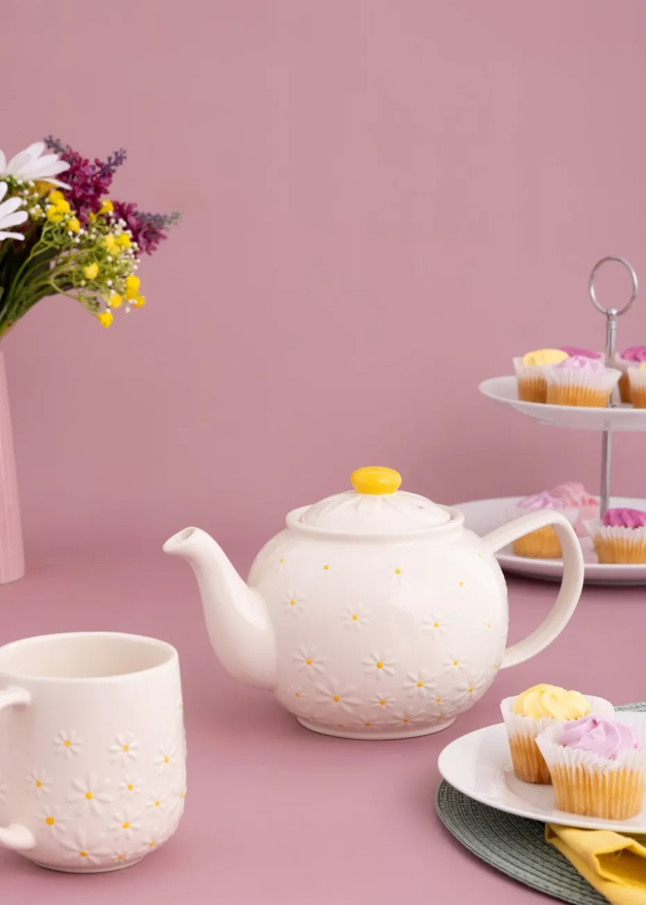The Price & Kensington Daisy 6 Cup Teapot features a white glaze with whimsical daisy embossments, finished with a delicate hand painted yellow in the centre. The novelty embossed lid replicates the intricate detail of a daisy, hand-painted in a bright yellow shade. In our signature iconic ‘Betty’ shape, the teapot is crafted from fine durable stoneware, keeping contents hotter for longer and also prevents chipping. With a non-drip spout, ergonomic pouring handle, and a generous 1100ml capacity, this functional, yet aesthetically pleasing teapot, is a delightful addition to any home decor or as a gift for tea enthusiasts and collectors alike. The teapot can also be used with or without the Price & Kensington stainless steel filter and is both dishwasher and microwave safe, making it perfect for everyday use. Inspiring teapots & table tops since 1896, Price & Kensington is a well-known British brand, renowned for quality products. Whilst teapots remain at the heart of the product range, our every growing range of table top and dinnerware collections are sure to accommodate all tastes and styles.