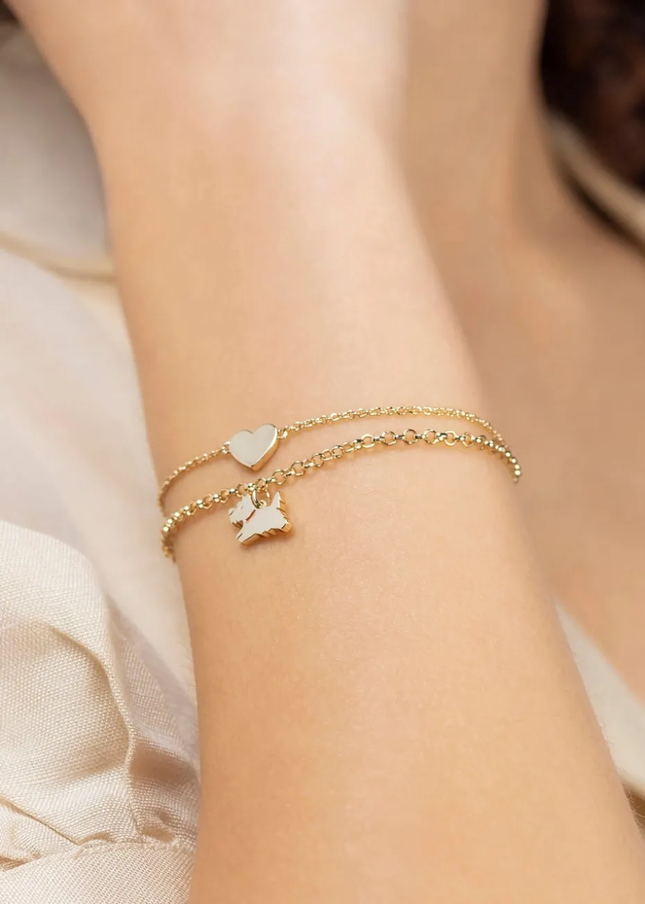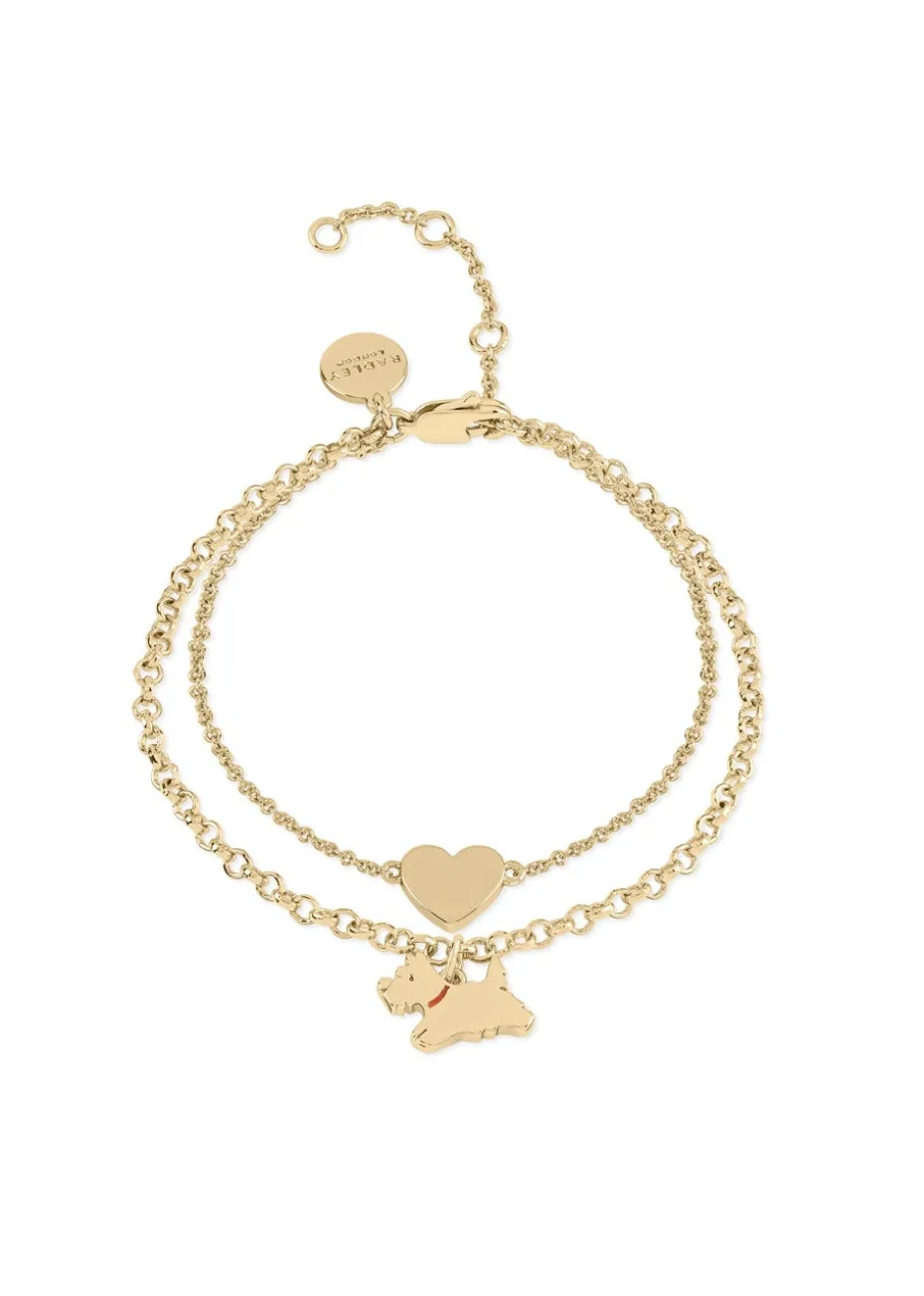 Radley Ladies 18ct gold plated double layer bracelet. This 18ct pale gold plated double layer features a fine belcher chain with heart charm and an ‘O’ link chain with a leaping dog charm with pink enamel collar. Includes Radley giftable packaging.