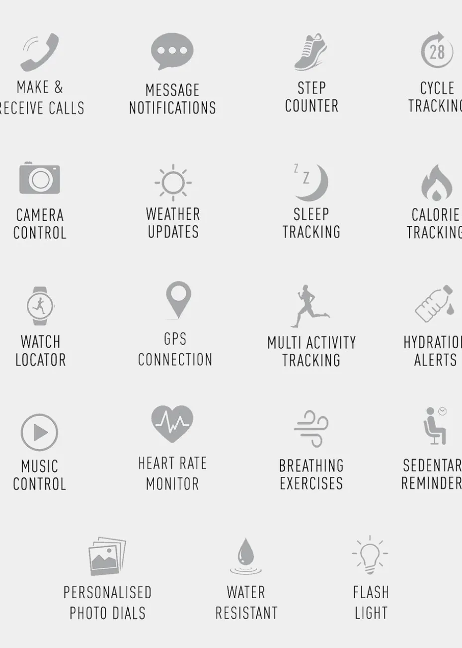 Meet Reflex Active Series 22 Smart Calling Watch – With convenient calling features, this smartwatch offers seamless communication from your wrist, ensuring you’re always connected on the go. Say goodbye to missed calls as you enjoy the convenience of hands-free calling. Your well-being is at the heart of Reflex Active Series 22. It’s not just a smartwatch; it’s your personal wellness coach. This intelligent device comes equipped with health reminders that encourage a balanced and mindful lifestyle. Receive prompts for staying hydrated, keeping active, and other essential self-care activities throughout your day. Your health is a priority, and this smartwatch is here to remind you of that. Stay committed to your fitness goals with a wide range of tracking options. Monitor your daily steps and calories burned. Keep an eye on your heart rate to ensure you’re exercising within your optimal heart rate zone. The intuitive interface provides quick access to all your essential features and notifications, ensuring you’re in control. The responsive 1.38″ touch screen makes navigation a breeze, and the durable, stylish IP67 design is built to withstand your daily adventures with up to 5 day battery life and soft silicone strap. Product dimensions: 45mm x 12mm x 245mm (width, depth, length) To explore the full range of features, download the free Reflex Active Red App, compatible with Android 5.0 & above and iOS 9.0 & above. Includes charger & 2 year guarantee.
