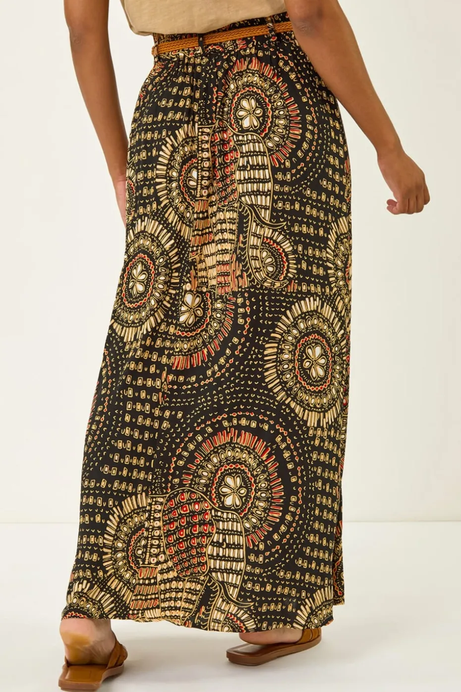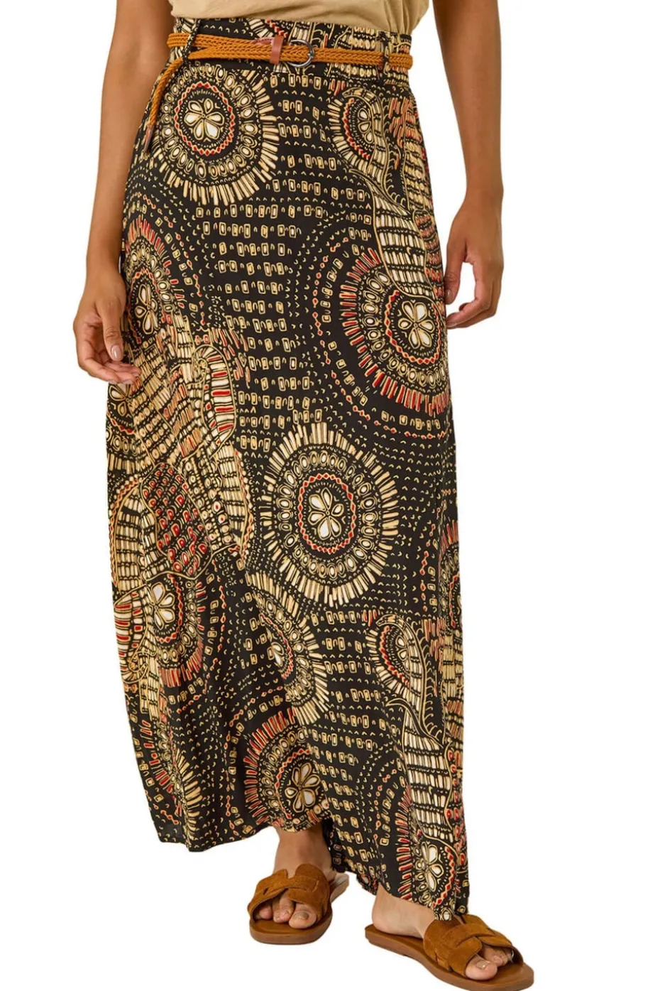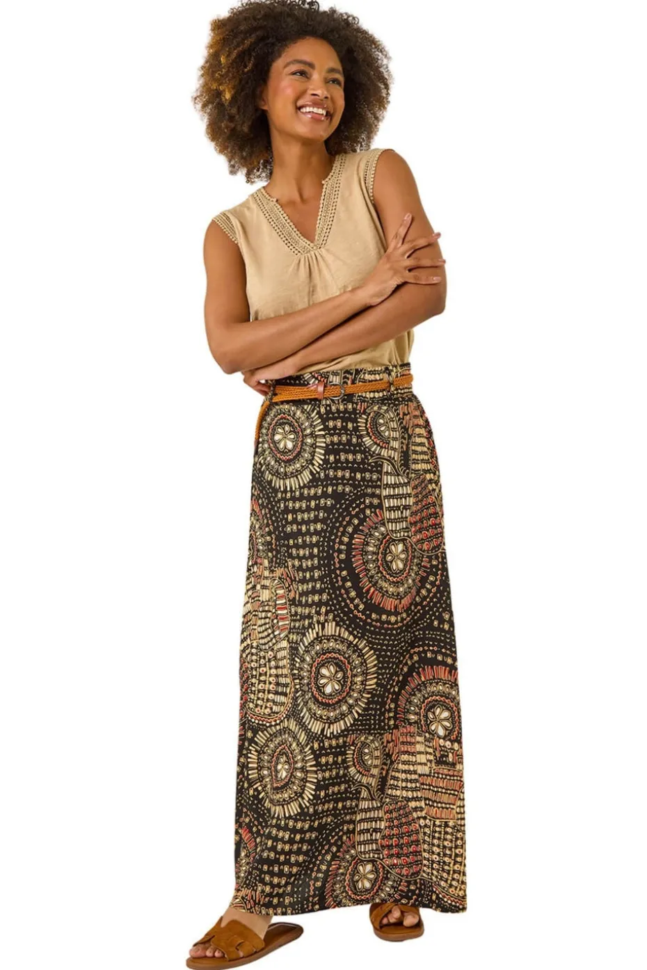 Abstract Print Belted A-Line Skirt from Roman. Stay on-trend this season with this fabulous abstract print a-line skirt. Featuring a comfortable elasticated waistband with belt detail at the back, this midi-length skirt is crafted from a beautiful woven fabric adorned with a striking print. The a-line shape offers a flattering fit, making it perfect for all body types. Pair with a blouse and wedge heels for a stylish Spring look!
