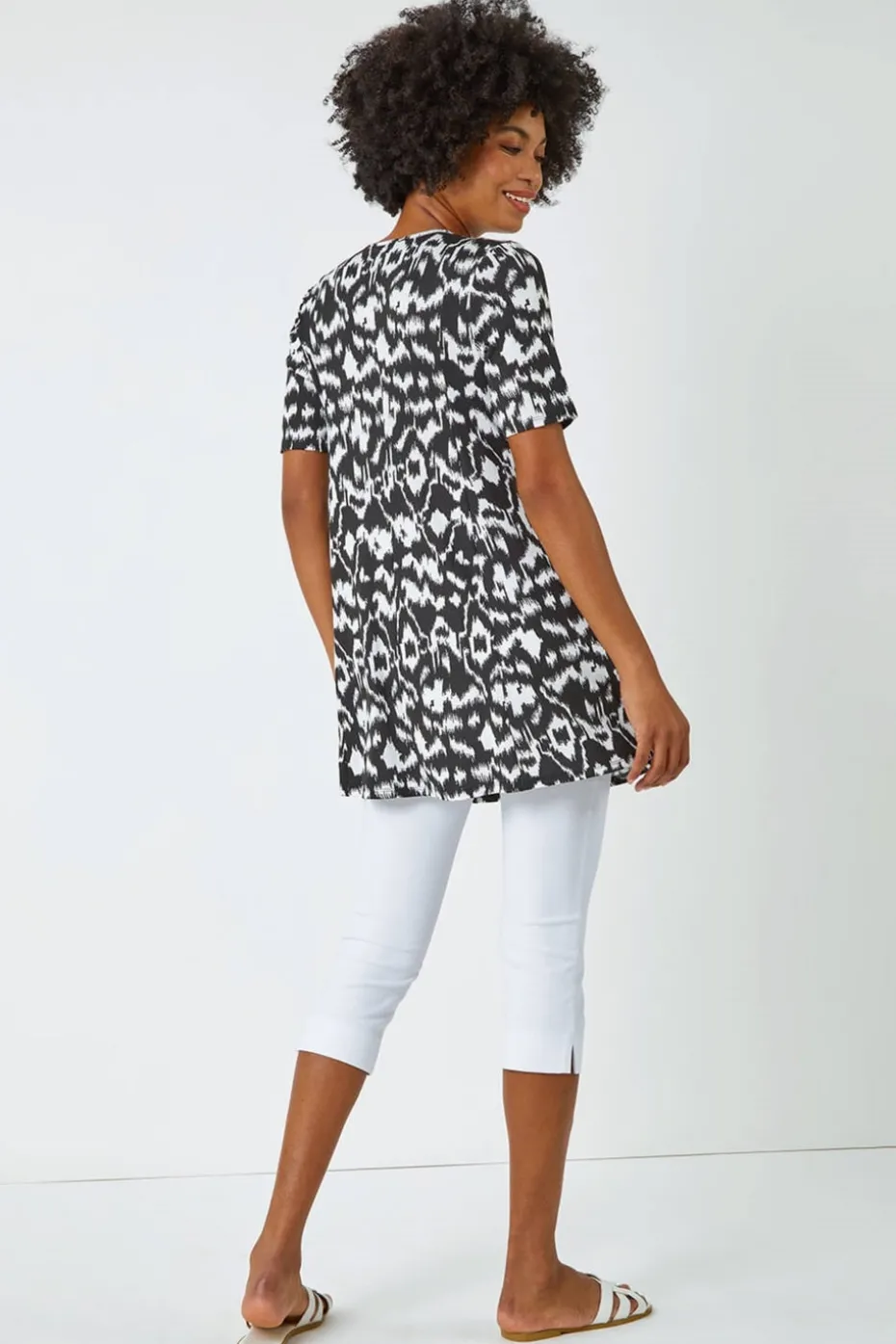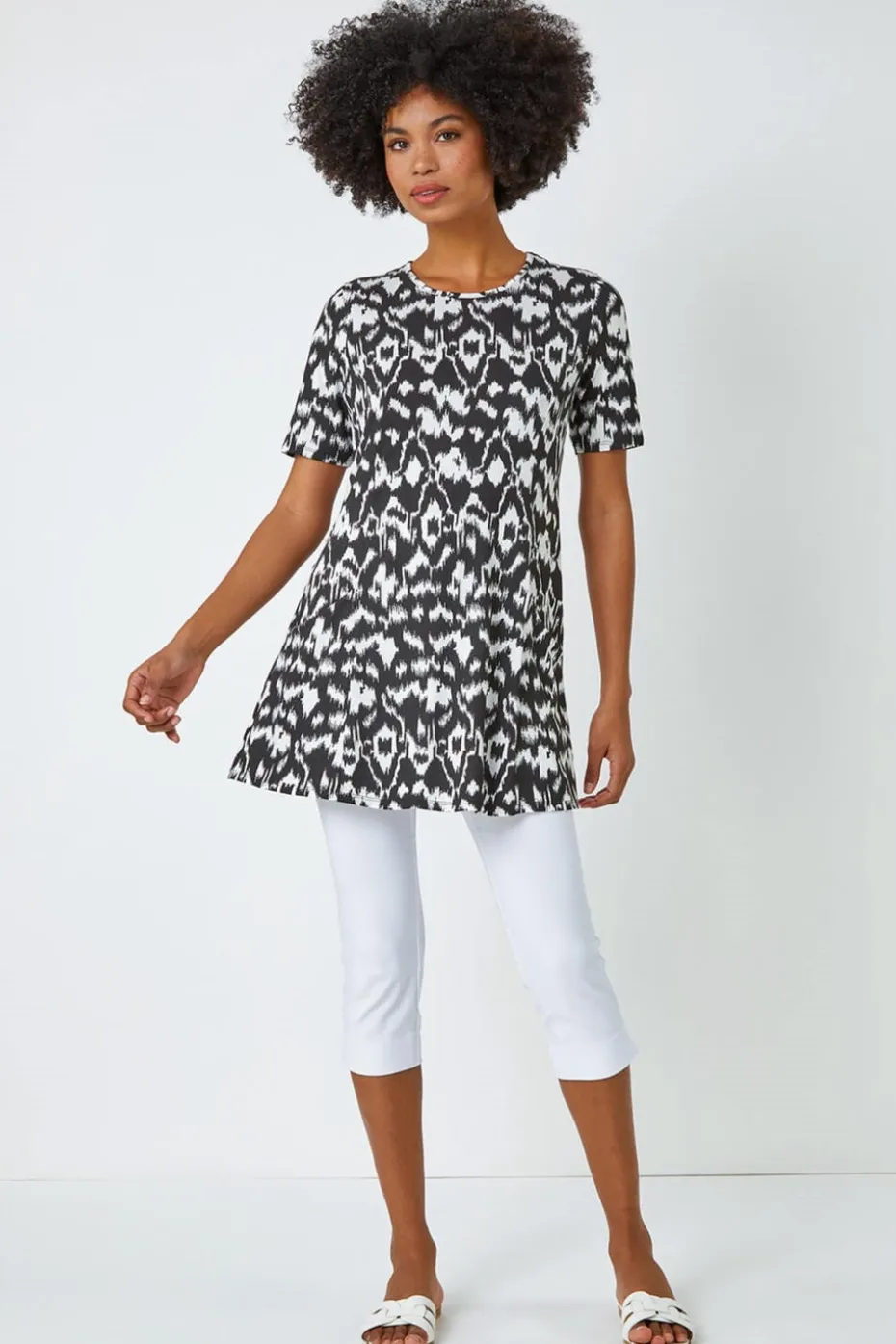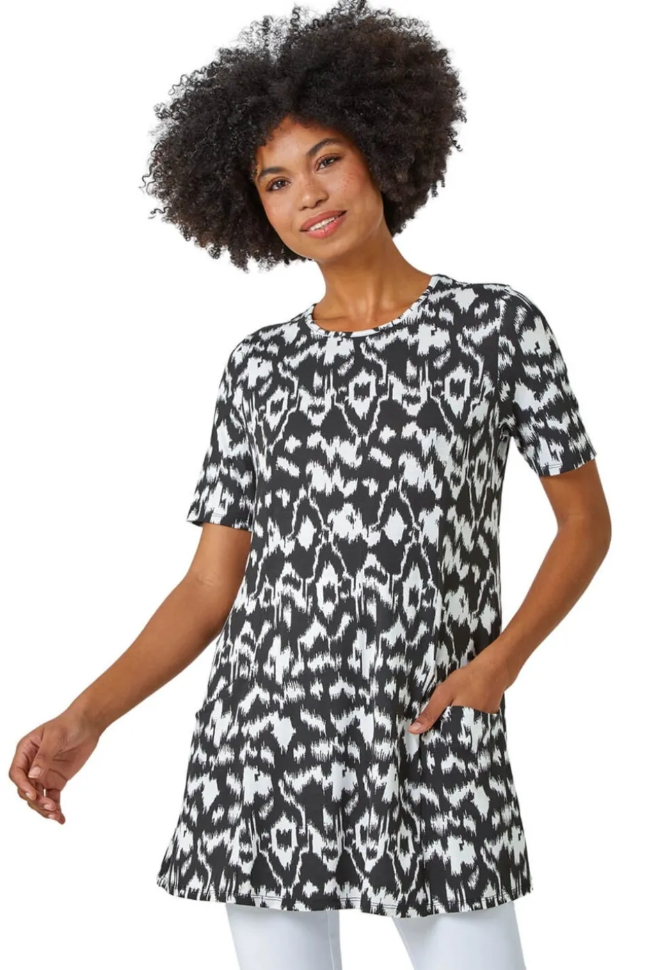 Aztec Print Pocket Tunic Top from Roman. Striking Aztec prints are key for the Summer months and this pocket detail tunic is a laid back way to incorporate it into your wardrobe. Cut from a stretch, jersey fabric this piece features a modest round neckline and fun, short sleeves. Pockets add a playful yet practical element to the piece. Designed to pull on overhead, this top is designed in a flattering tunic shape offering extra coverage, making it the perfect top to pair with our cropped stretch trousers. Add a denim jacket and sandals for an effortless look
