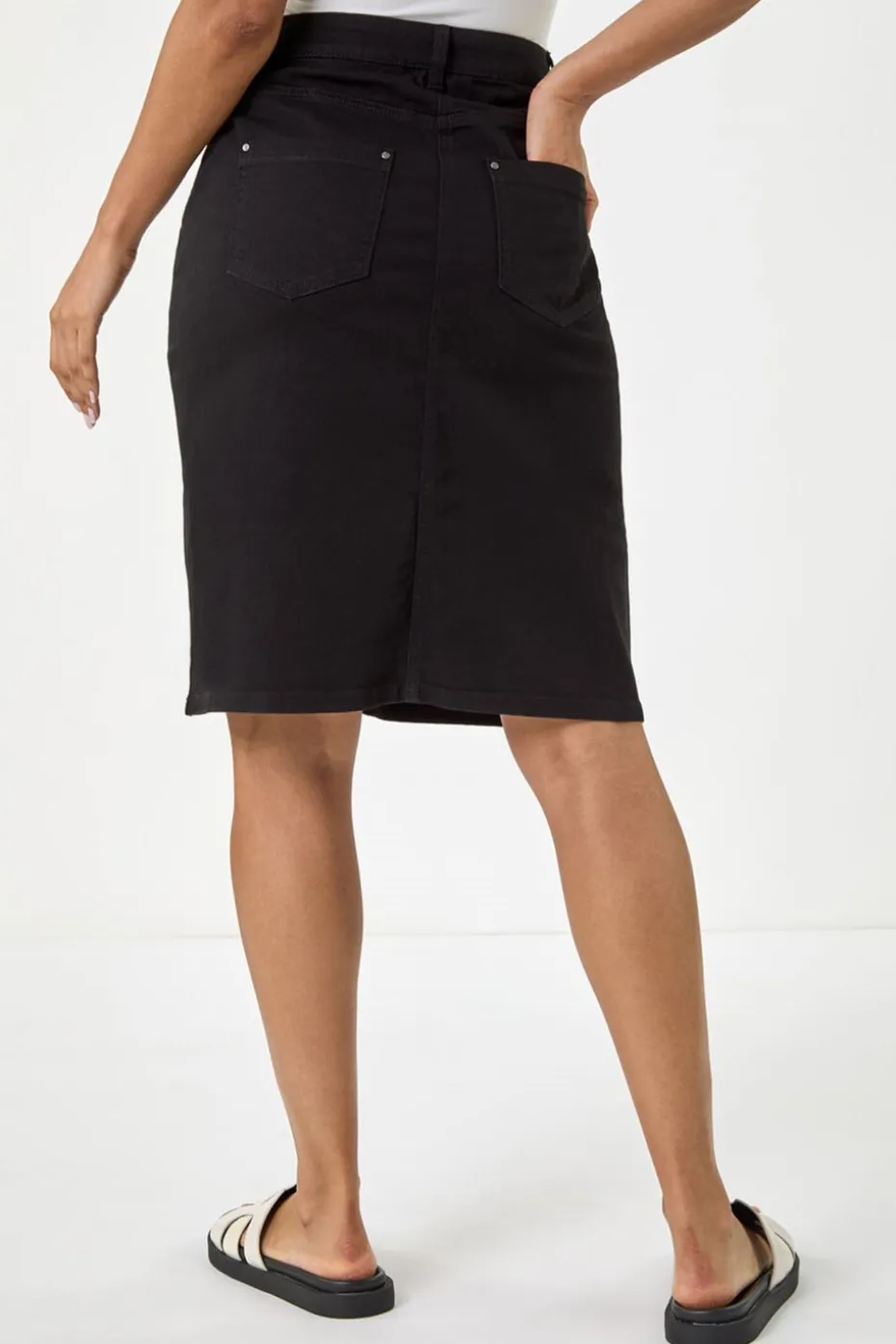 Be the first to review “Roman Black Cotton Denim Stretch A line Skirt” Cancel reply