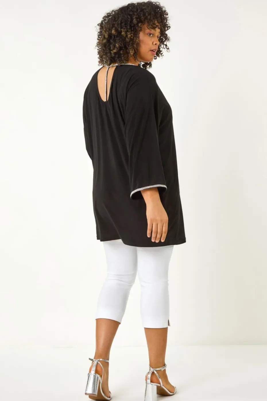 Curve Diamante Trim Stretch Top from Roman. Get ready to sparkle and shine in this must-have diamante top for the Autumn/Winter season. Featuring a glamorous diamante trim on the neck and sleeve cuffs, this top is designed with a chic t-bar detail at the back. Cut in a figure-flattering below hip length with elegant 3/4 sleeves, all in a comfortable stretchy jersey fabric. Pair with pleather trousers and heeled boots for a sophisticated and party-ready ensemble!
