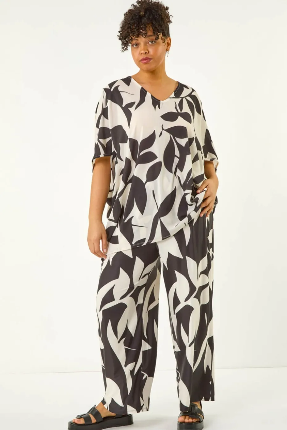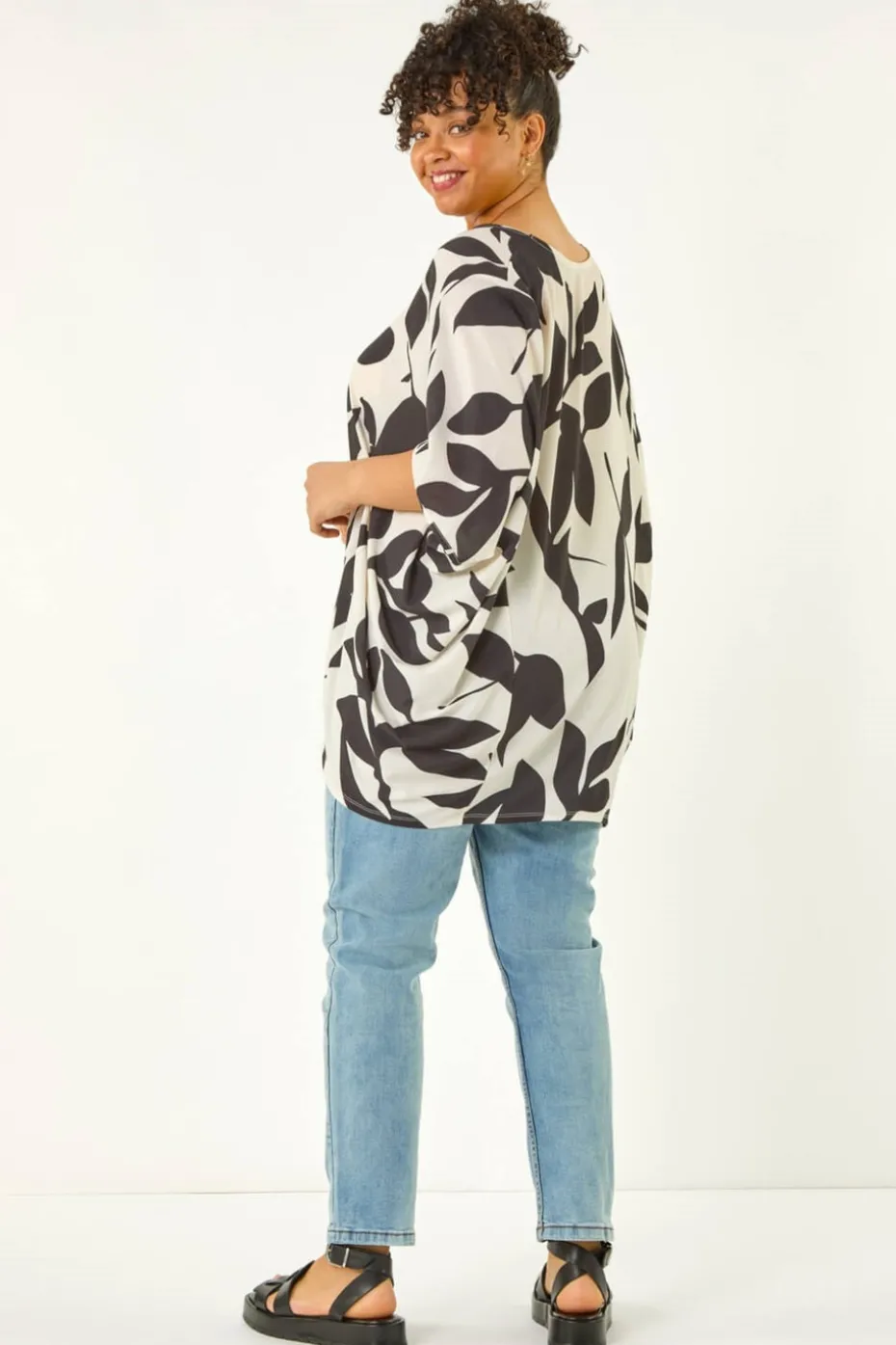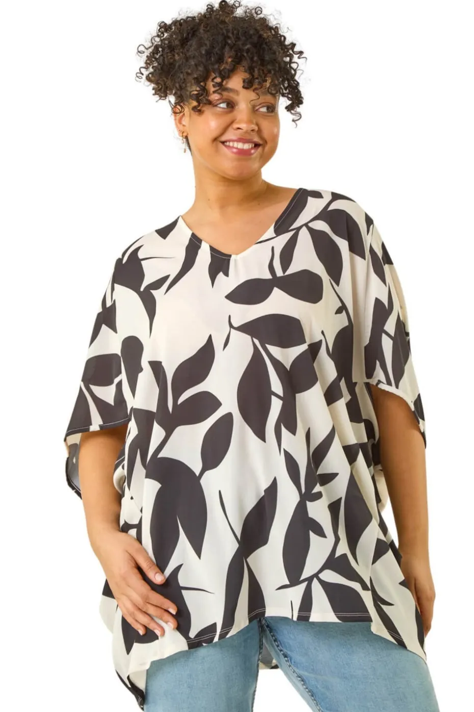 Curve Large Floral Print Cocoon Top from Roman. This top features an all over large floral print on woven fabric, with a flattering V-neckline and short sleeves. It finishes just below the hips, offering a relaxed yet stylish silhouette. Perfect for pairing with jeans or skirts, this piece is ideal for the spring and summer seasons.