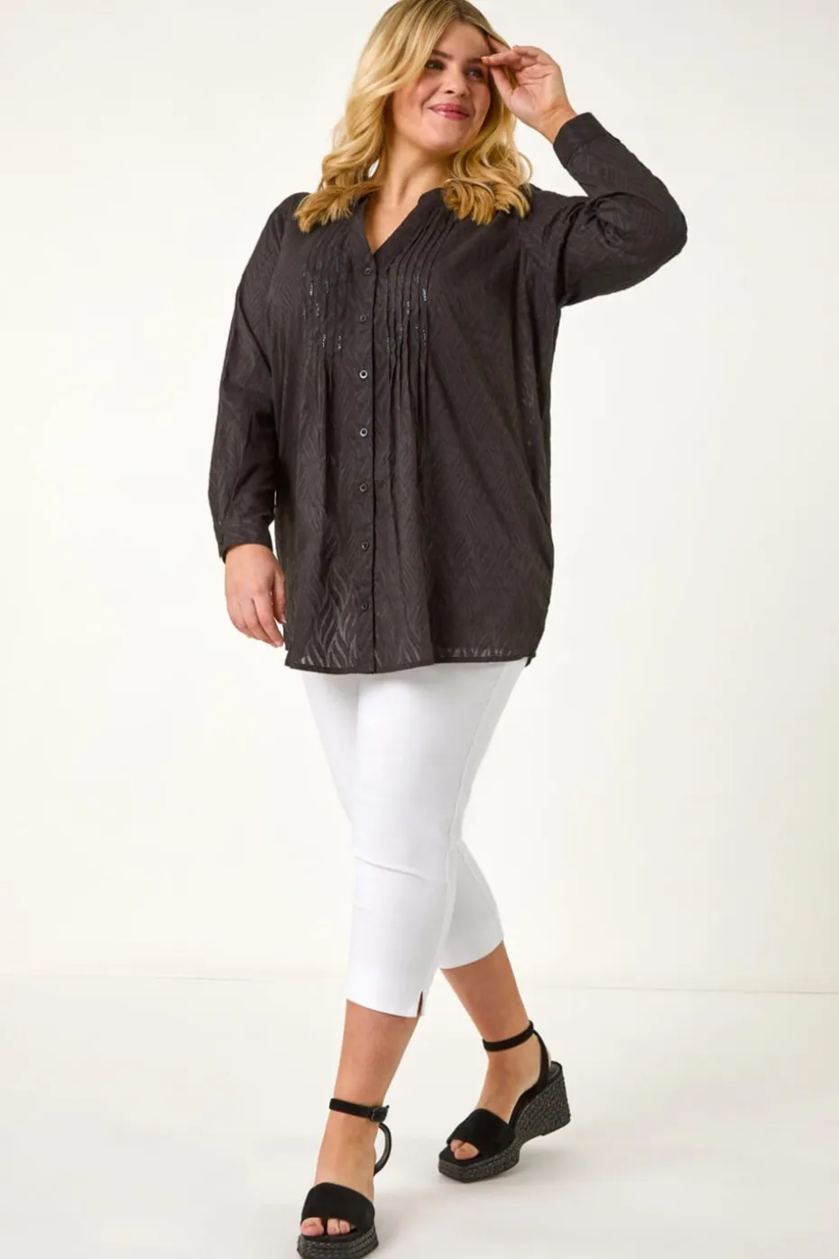 Curve Shimmer Jacquard Blouse from Roman. This elegant top is crafted from jacquard woven fabric, featuring long sleeves and a flattering V-neckline. The button-through centre front adds a classic touch, while the sequin shimmer detail on the pintucks provides a subtle, sparkling accent. Pair it with sandals and jeans for a chic spring or summer look that’s both stylish and comfortable!
