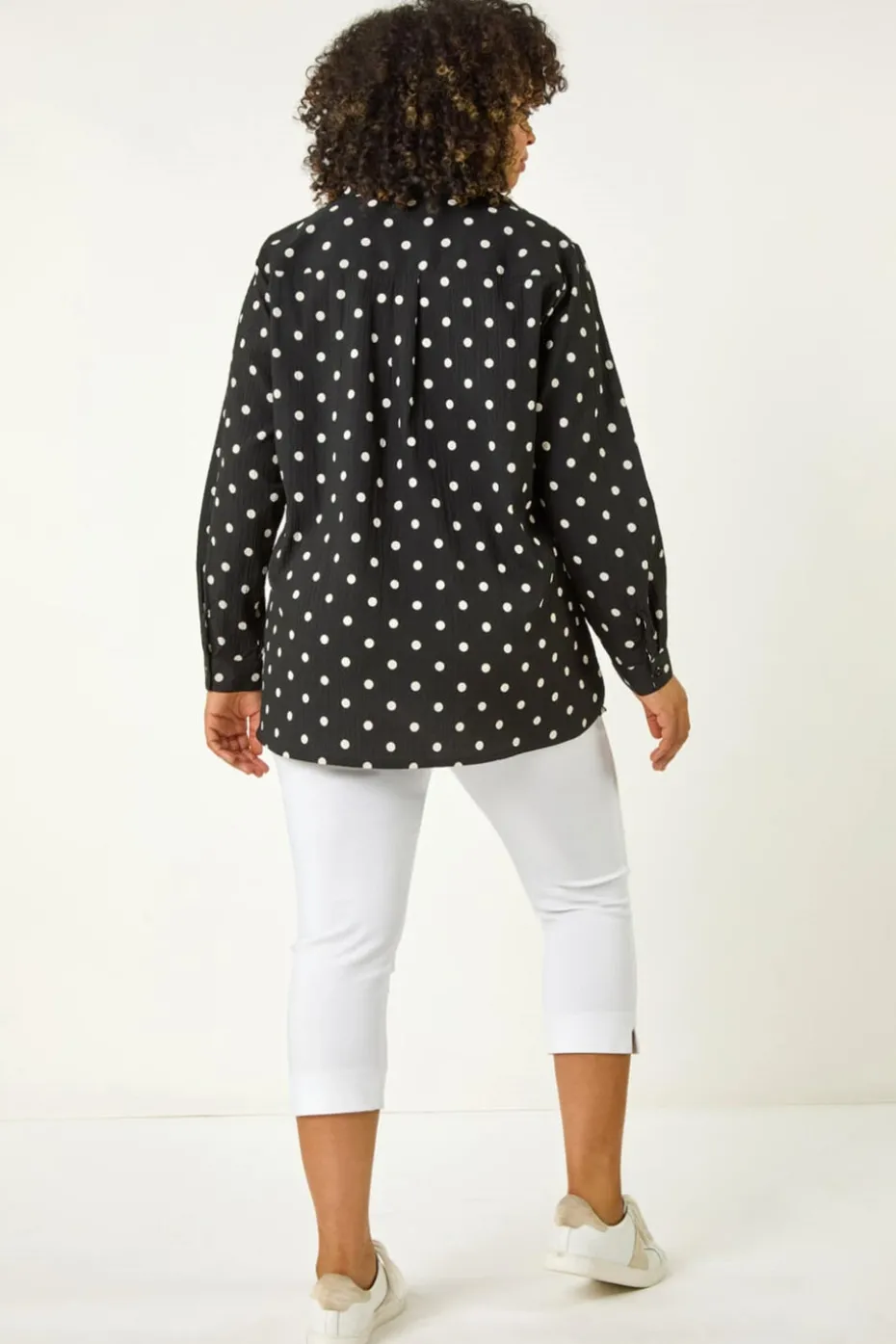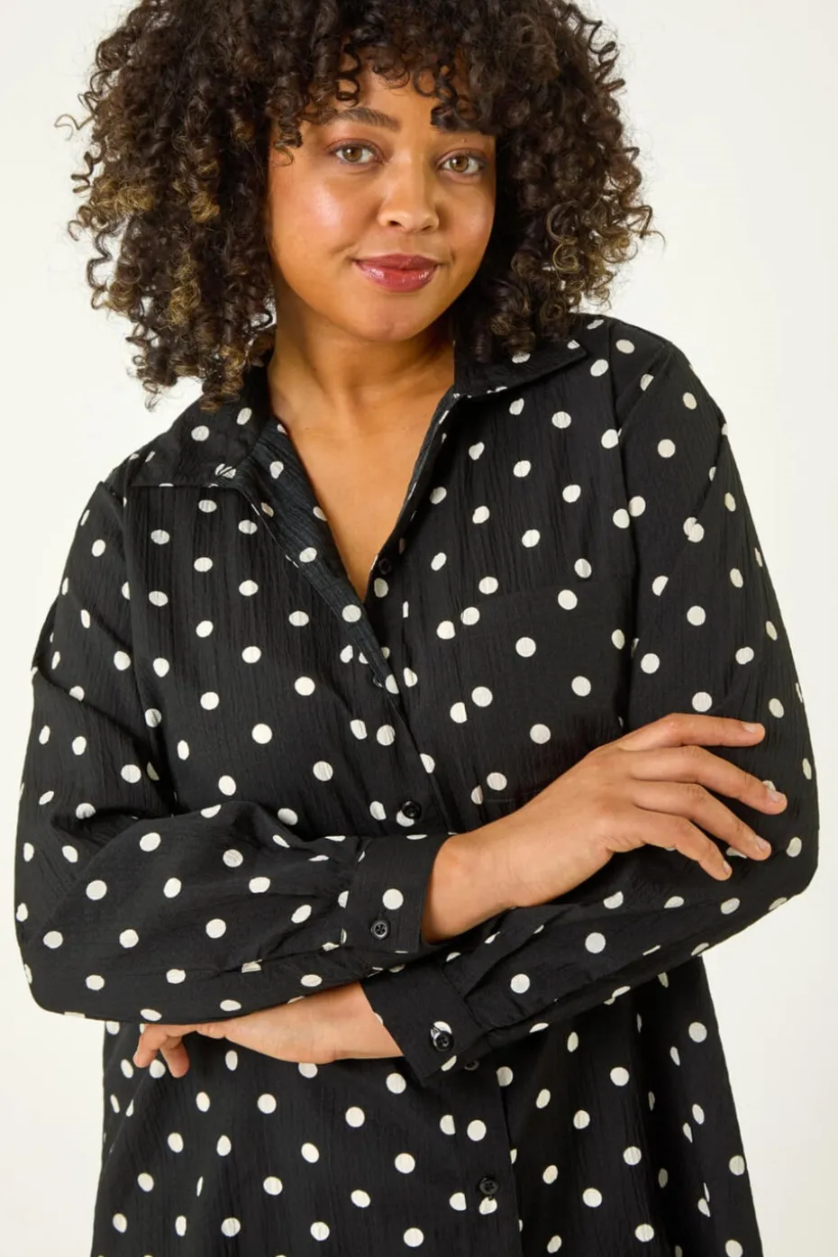 Curve Spot Print Button Shirt from Roman. This elegant shirt showcases an all over spot print on textured woven fabric, adding a subtle yet stylish touch. The button through front and long sleeves with button cuffs create a polished look, while the below hip length offers versatile styling. With a sleek, pocket free design, this piece pairs effortlessly with jeans and sandals for a refined casual outfit.