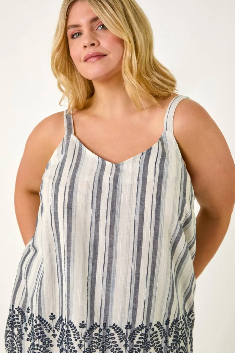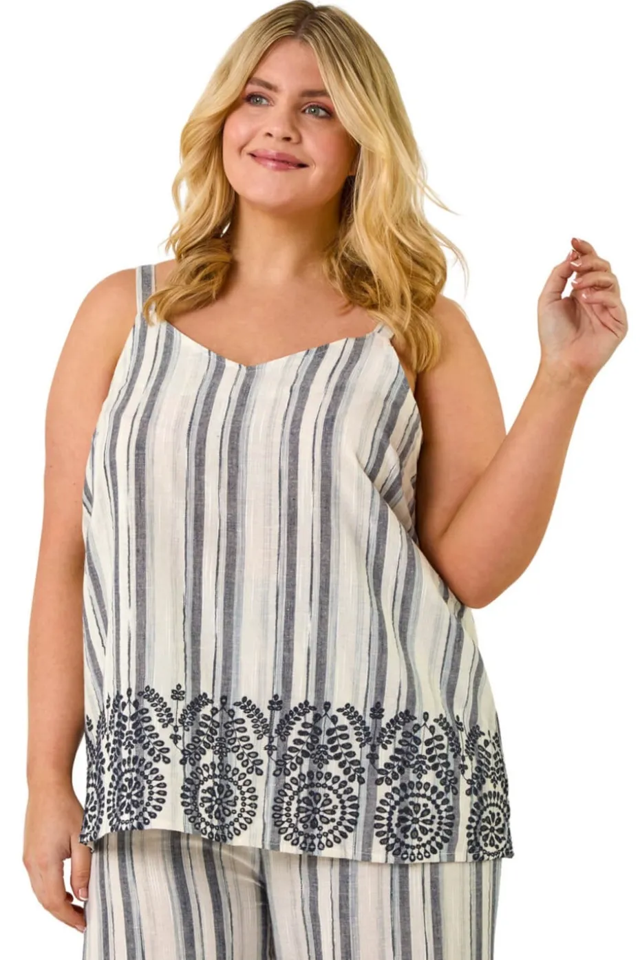 Curve Strappy Broderie Hem Vest from Roman. Unleash your summer vibe with this charming broderie hem vest. Crafted from a lightweight woven fabric with an all-over stripe pattern, this top features delicate straps for a feminine touch. The detailed broderie hem adds a romantic feel, making it a perfect match with the coordinating trousers. Pair with sandals for a chic and stylish look that’s perfect for warm summer days.