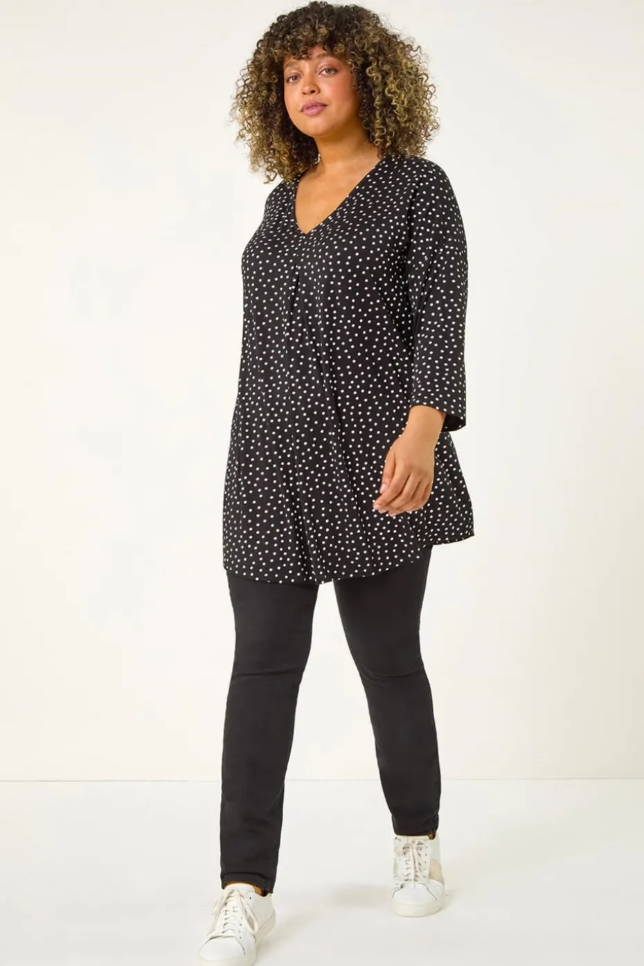 Curve V-Neck Spot Print Tunic from Roman. Embrace this season in style with our charming Curve spot print tunic. The feminine v-neckline and pleat front detail adds a touch of elegance, while the long sleeves and tunic length offer a flattering fit for all body shapes. Crafted from comfortable stretchy jersey fabric, this dots for days top is perfect for any Autumn Winter outfit. Pair with jeggings and ankle boots for a trendy fall look!