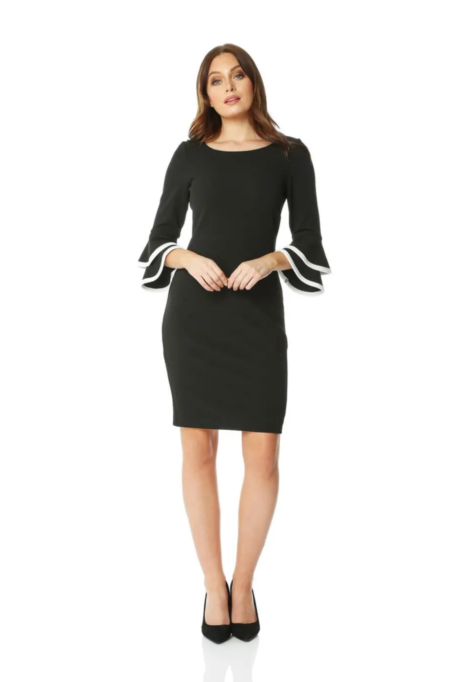 Double Fluted 3/4 Length Sleeve Shift Dress from Roman. Stride into the boardroom with confidence in this chic little black dress. Featuring a double fluted cuff detail with contrasting binding, this dress is fully lined and fastened with a concealed zip. This dress will take you from desk to dinner in style, finishing at a demure knee length.