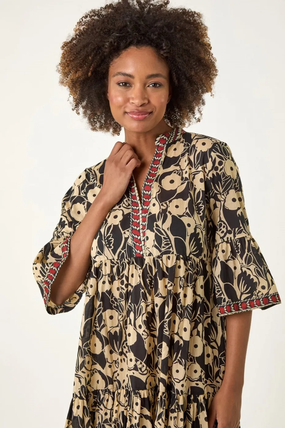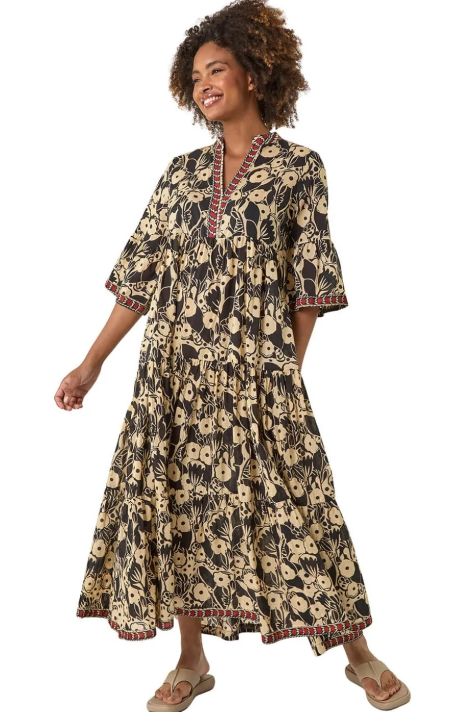 Floral Print Border Maxi Dress from Roman. Get ready to bloom this Spring Summer in our delightful floral print maxi dress. Featuring a flattering v-neckline and 3/4 sleeves, this dress is crafted from a soft cotton fabric adorned with a stunning border floral print. The dress flows beautifully into a smock shape, finishing at a flattering maxi length. For the perfect look, team with a denim jacket and wedged heels and step out in style!