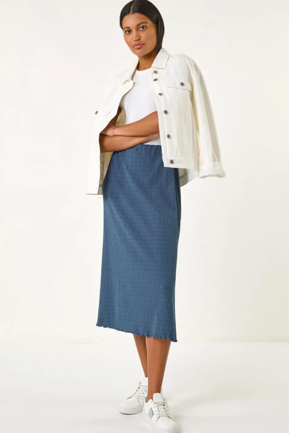 Textured Fluted Hem Midi Skirt from Roman. Get ready to twirl in style with this textured fluted hem midi skirt. Cut from a comfortable stretch jersey fabric, this skirt features a flattering pencil shape that falls gracefully at a midi length. The unique textured detail adds an extra touch of sophistication. Complete your Spring Summer outfit by pairing this skirt with a denim jacket and wedged heels for a trendy look!