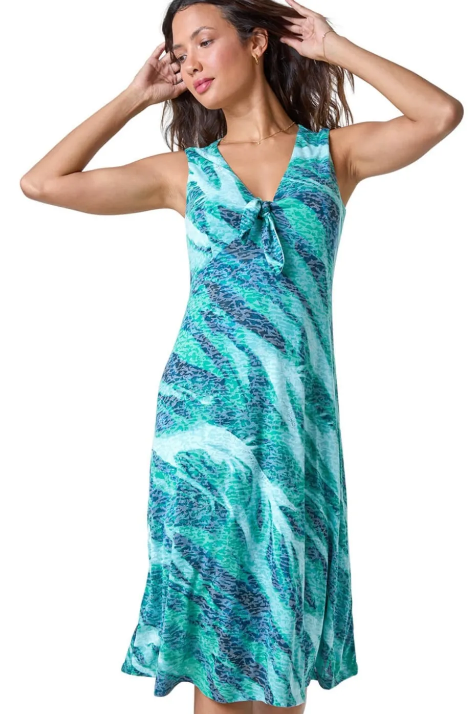 Burnout Abstract Knot Front Stretch Dress from Roman. Transport to somewhere hot and sunny in our striking wave print midi dress! This abstract design dress has Summer written all over it with its dreamy burnout print and statement twist front detail. This fit and flare dress is made from a stretch jersey fabric which is easy to pull on over the head for day to night occasions. Pair with your favourite sandals and a sun hat for a beach look or take it into the evening with heeled wedges and a shrug.