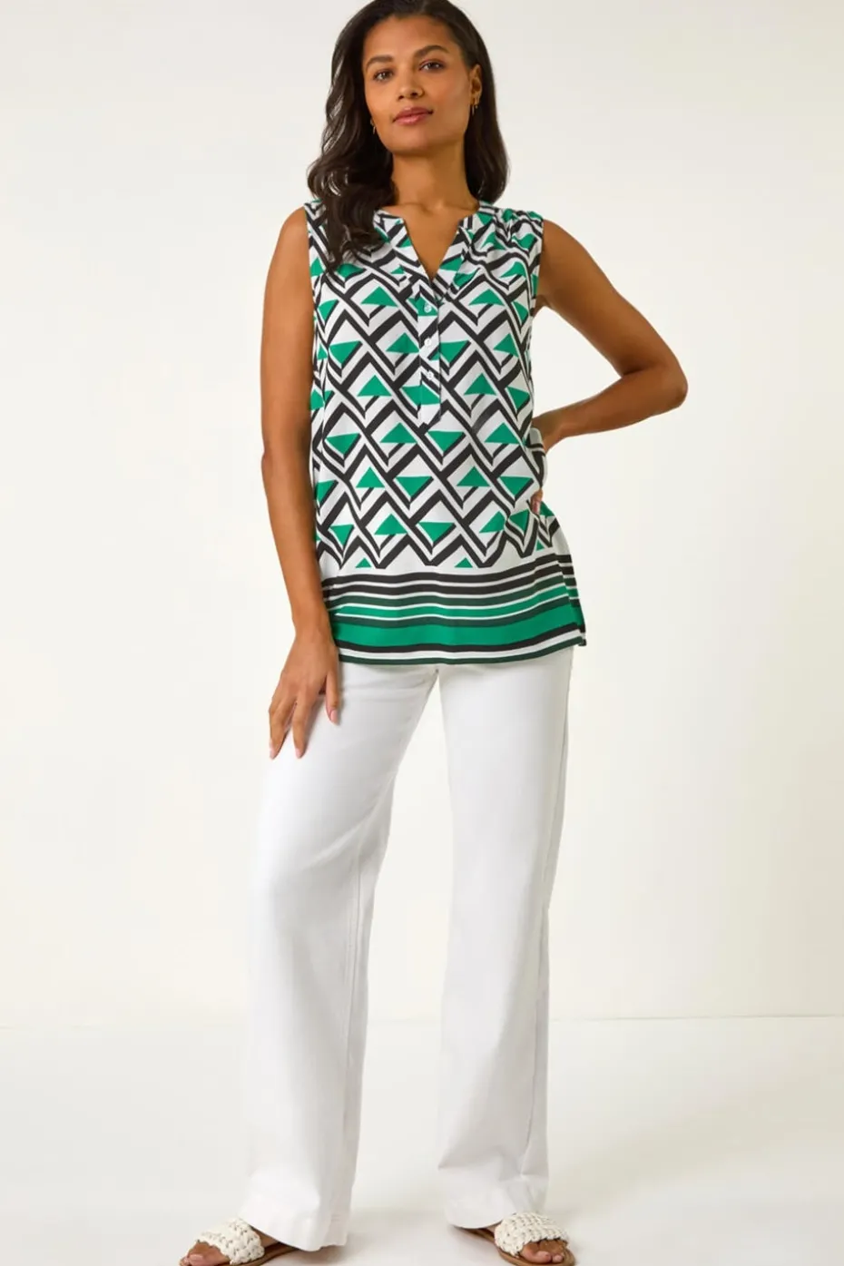Geo Print Border V-Neck Vest from Roman. Add a touch of playful flair to your Spring Summer wardrobe with this geo print v-neck vest. The sleeveless style and feminine v-neckline make it perfect for warmer days, while the comfortable woven fabric ensures all-day comfort. Featuring a striking geometric print with a stripe hem border and a front button placket, this vest is both stylish and versatile. Complete your look by pairing it with a denim jacket and jeggings for a trendy ensemble!
