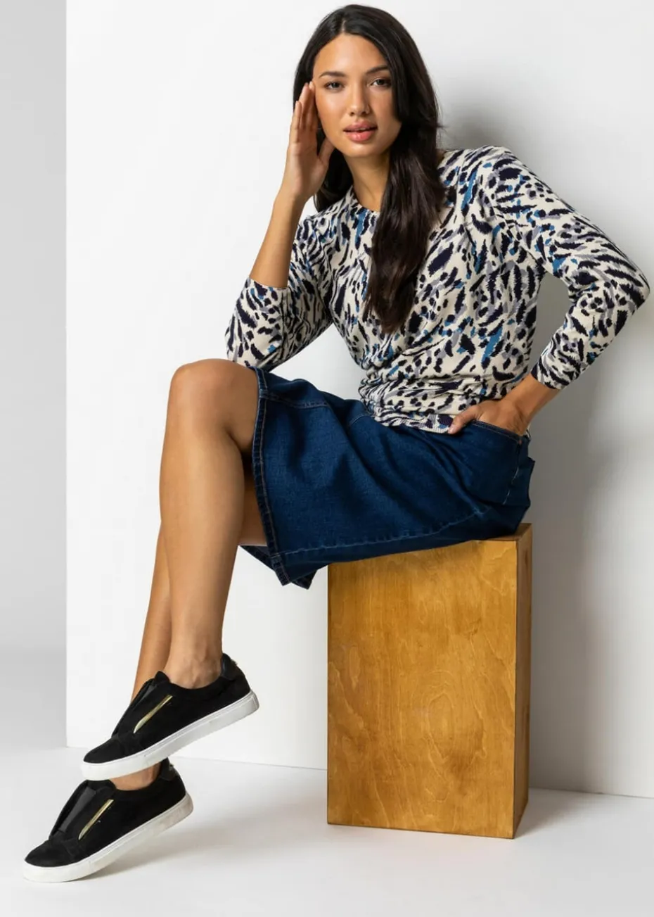 Cotton Denim Stretch A line Skirt from Roman. Add some fun denim to your Spring collection with this cotton denim skirt. Cut from a cool and comfortable, cotton denim fabric, this skirt has a slight stretch for a flattering and smooth fit. Secured with a zip fly and button fastening, this skirt features functional belt loops and practical back patch pockets. Pair with printed bardot tops for fun Summer style or add a bodysuit, longline lightweight cardigan and trainers for a day of sightseeing!