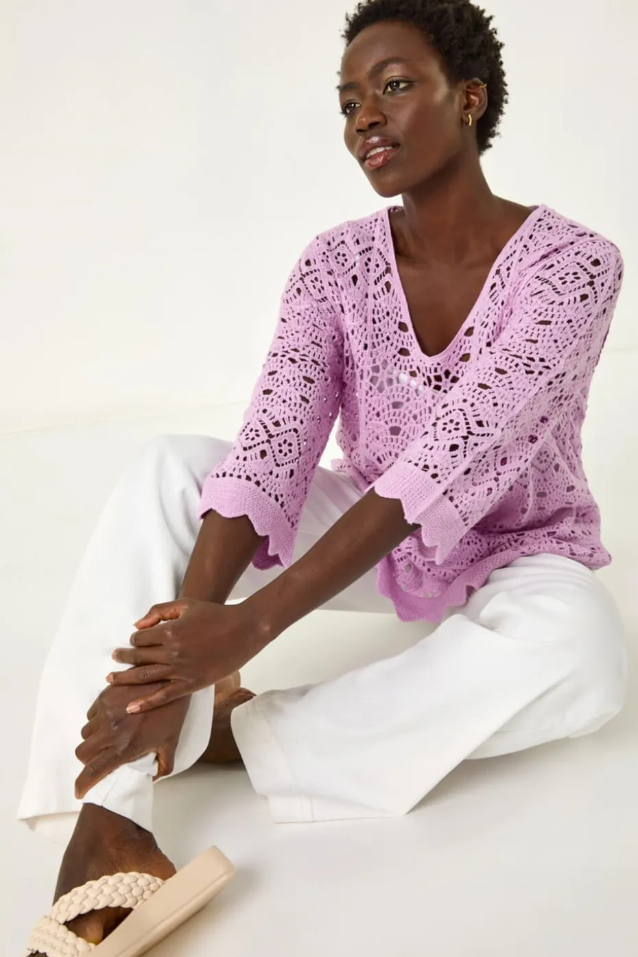 Roman Lavender Crochet Scallop Edge Knit Tunic