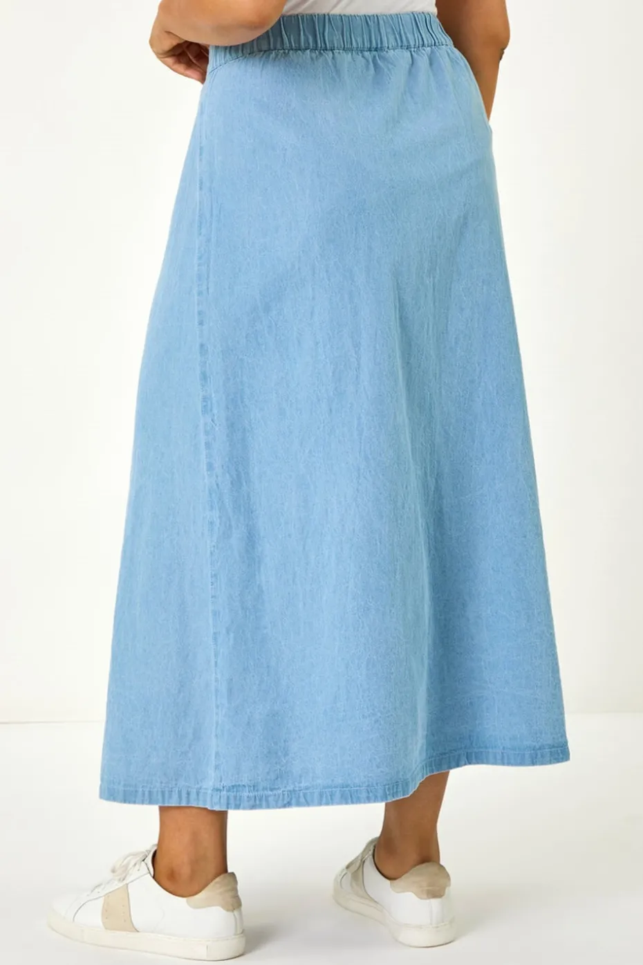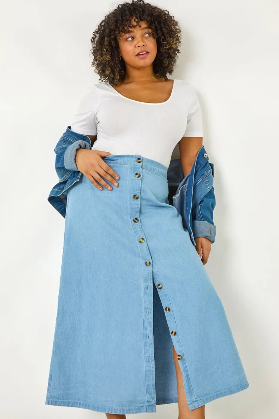 Curve Button Through Denim Skirt from Roman. Give your Spring Summer wardrobe a refresh with this elegant Curve button-through denim skirt. The soft cotton fabric and elasticated back detail ensure a comfortable fit to add a touch of sophistication. Finishing in an a-line shape at a midi length, this skirt is versatile and stylish. Pair it with a white blouse and sandals for a complete outfit that exudes effortless style.