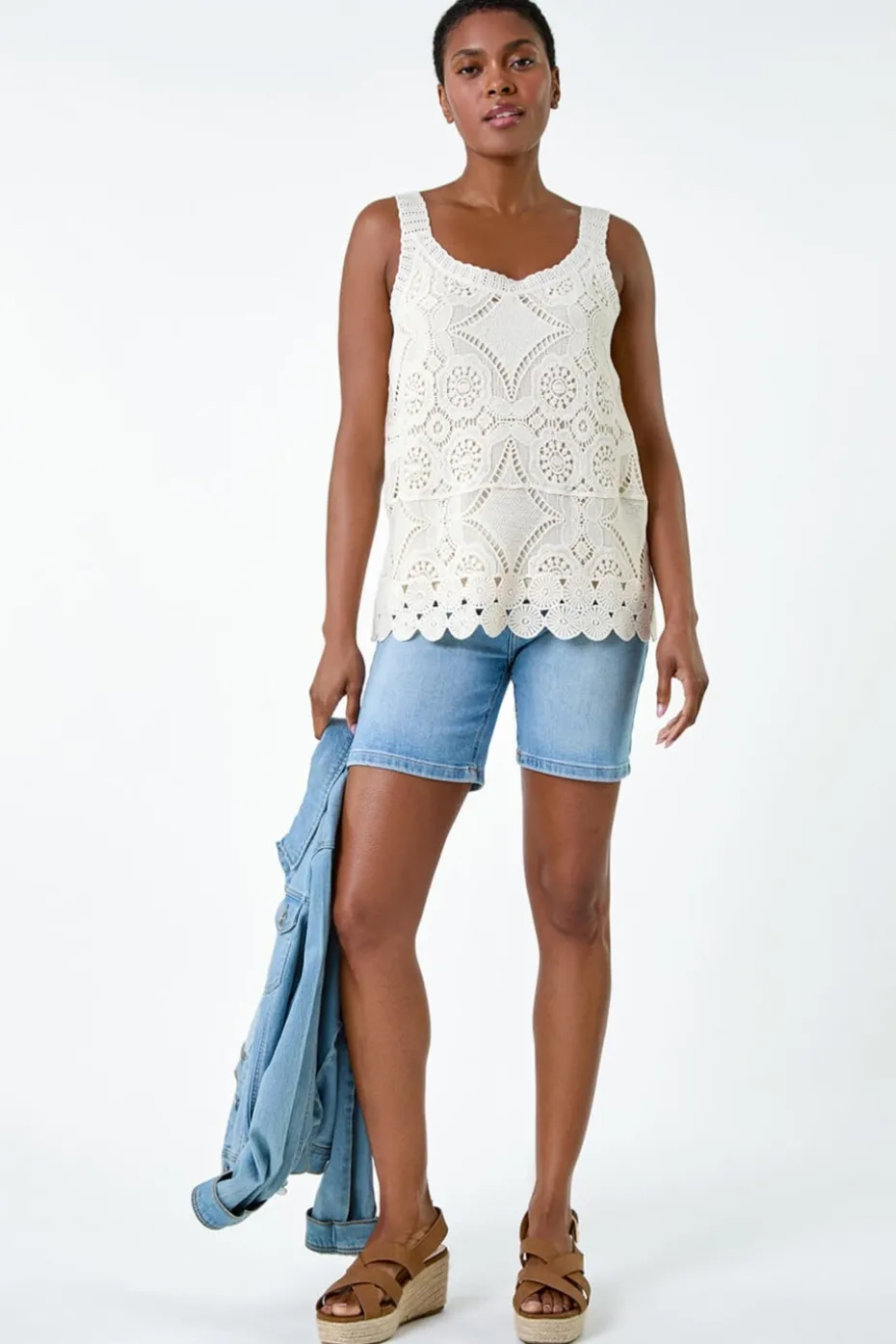Cotton Crochet Knit Vest Top from Roman. Tap into care-free Summer vibes with this charming knitted vest. Crafted from a cooling cotton crochet, this vest features a scallop detail at the hemline to add an ornate touch. It features a classic round neckline and sleeveless design, making it ideal for layering or wearing on its own. For a sweet Summer look, pair it with a denim jacket, shorts and sandals for a stylish and comfortable holiday ensemble.