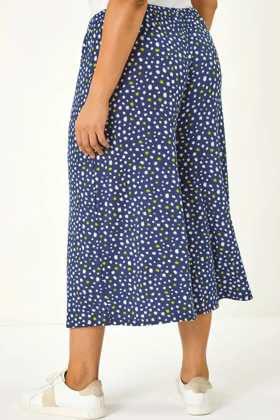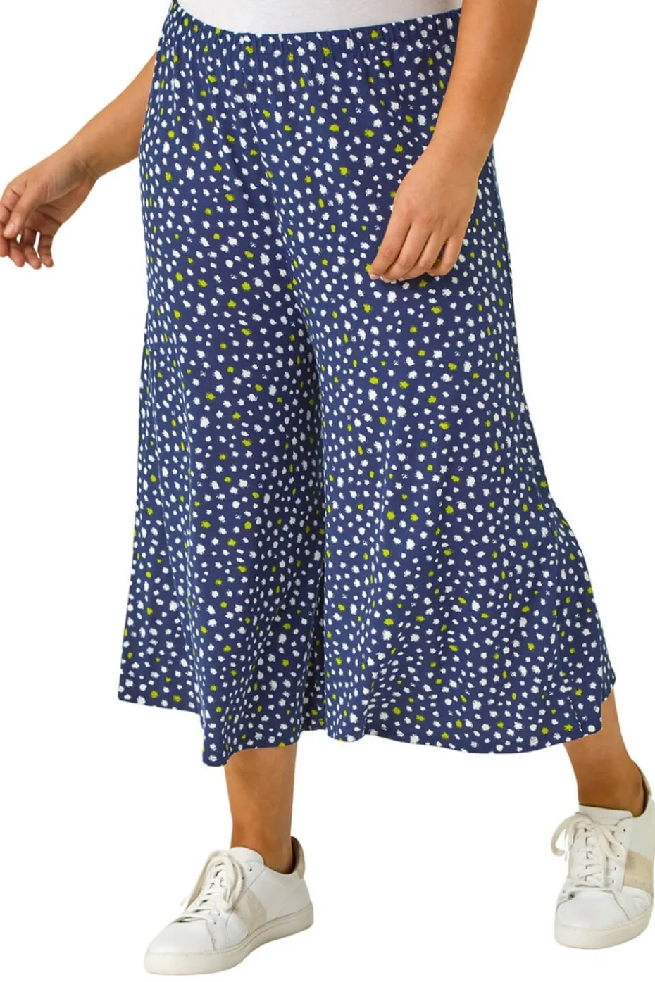 Curve Abstract Spot Culotte from Roman. Step into Spring with these chic printed culottes! Featuring a wide leg and culotte length, these trousers are both on-trend and comfortable. The all over abstract spot print adds a playful touch, while the elasticated waist ensures a perfect fit. Made from a stretchy jersey fabric, these culottes are easy to pull on for effortless style. Pair with a cami top and sandals for a laid-back yet stylish look this season!