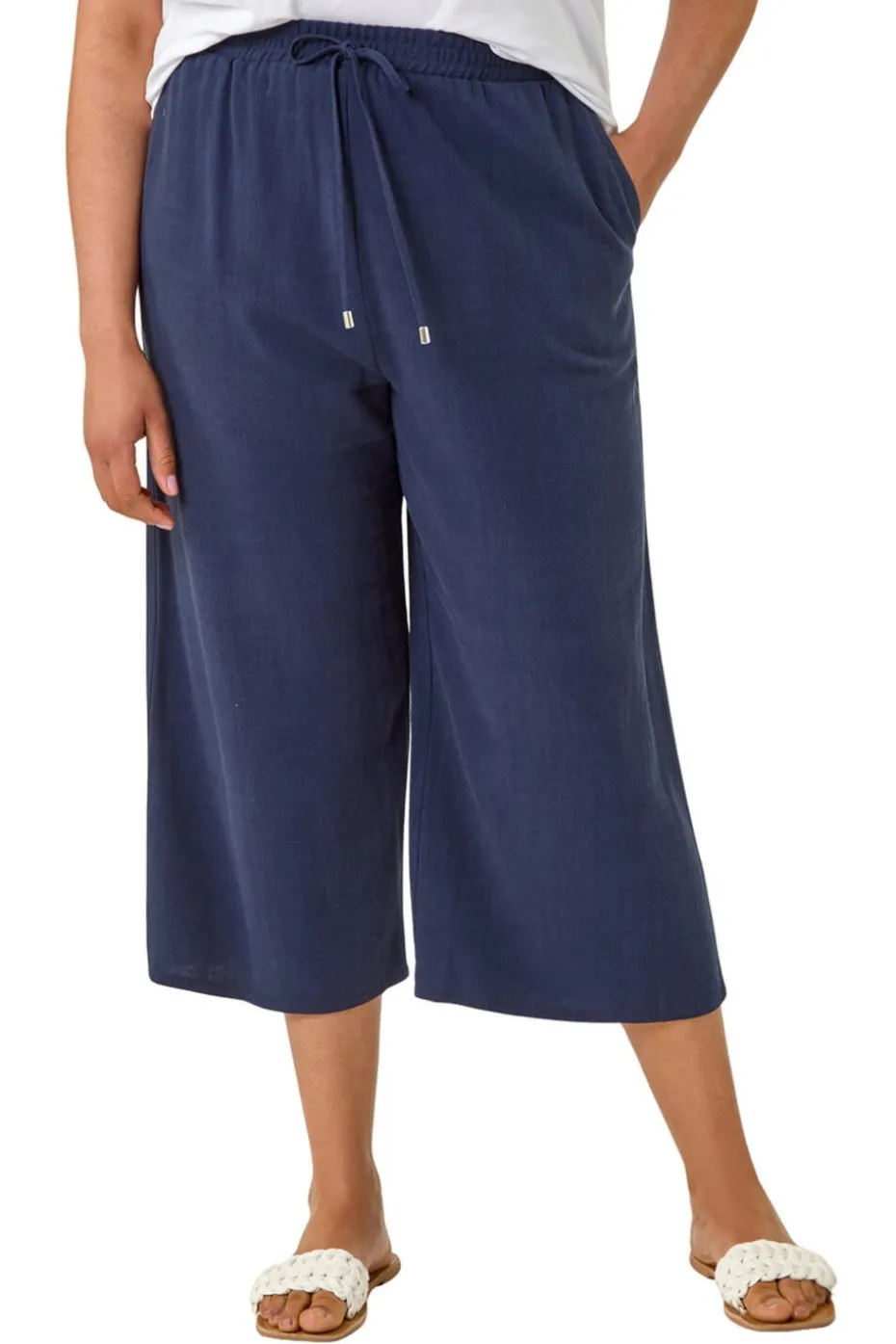 Curve Linen Mix Cropped Trousers from Roman. Step into the warmer months with these stylish linen mix crop trousers. Crafted from a breathable woven fabric, these trousers feature a comfortable elasticated waist and convenient pull-on design. The angled side pockets add a modern touch, while the cropped length is perfect for showing off your favourite sandals. Pair with a light cami top for a chic and effortless look that’s ideal for sunny days ahead!