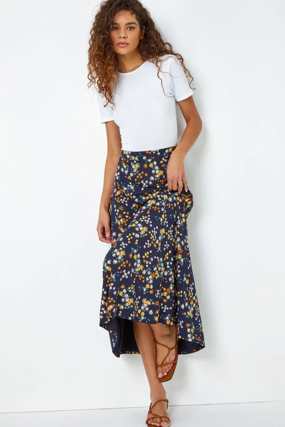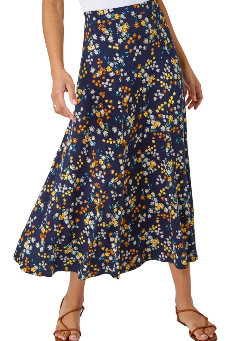 Ditsy Floral Print Elastic Waist Midi Skirt from Roman. Give a nod to the dark floral trend with this printed, jersey midi skirt. Featuring a ditsy, daisy print this skirt is cut from a stretch, jersey fabric and is designed to pull on for quick and easy dressing, with a comfortable elasticated waistband. Pair with a plain t shirt and barely there sandals for a fresh spring look!