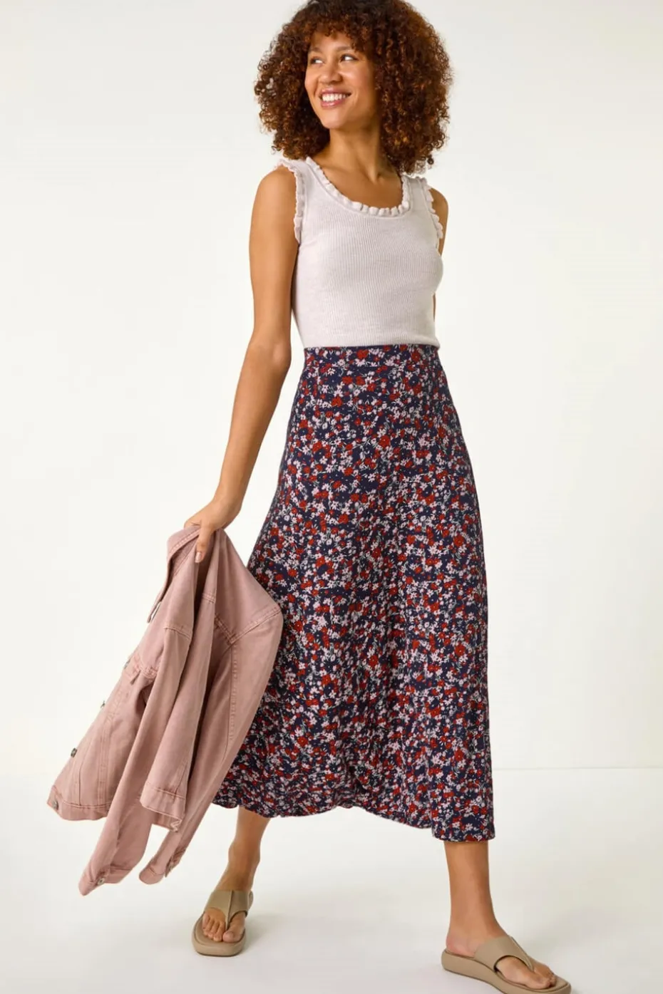 Ditsy Floral Stretch Midi Skirt from Roman. Get ready for the Spring season in style with this ditsy print midi skirt. Crafted from a comfortable stretch jersey fabric, this skirt features an elasticated waist for the perfect fit. The pretty ditsy floral print adds a touch of femininity to this versatile skirt, finishing at a flattering midi length in an a-line shape. Pair with a blouse and wedges for a trendy warm weather look!