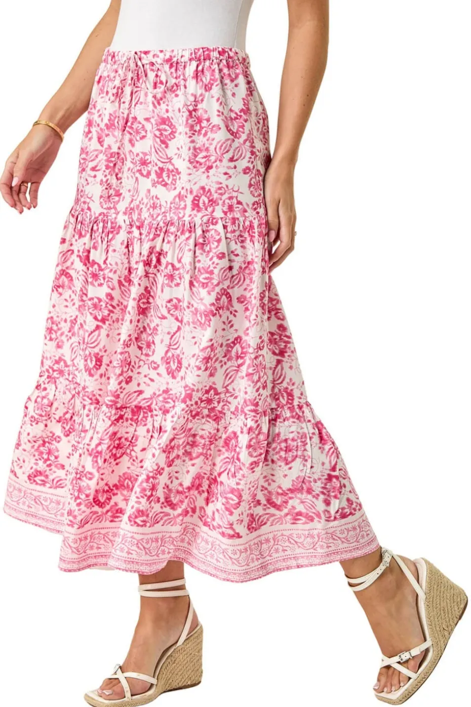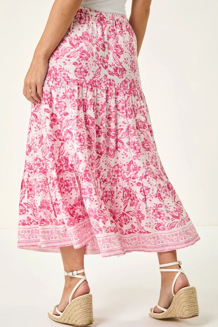 Petite Floral Print Tie Midi Skirt from Roman. Unleash your feminine charm with this Petite floral midi skirt! Designed for Spring Summer, this skirt features a flattering elasticated waist with a self-tie front belt for a perfect fit. Crafted from a comfortable woven fabric, this skirt showcases a beautiful floral border print and falls elegantly at a midi length with a trendy tiered style. Match it with a blouse and flats for a fresh look!