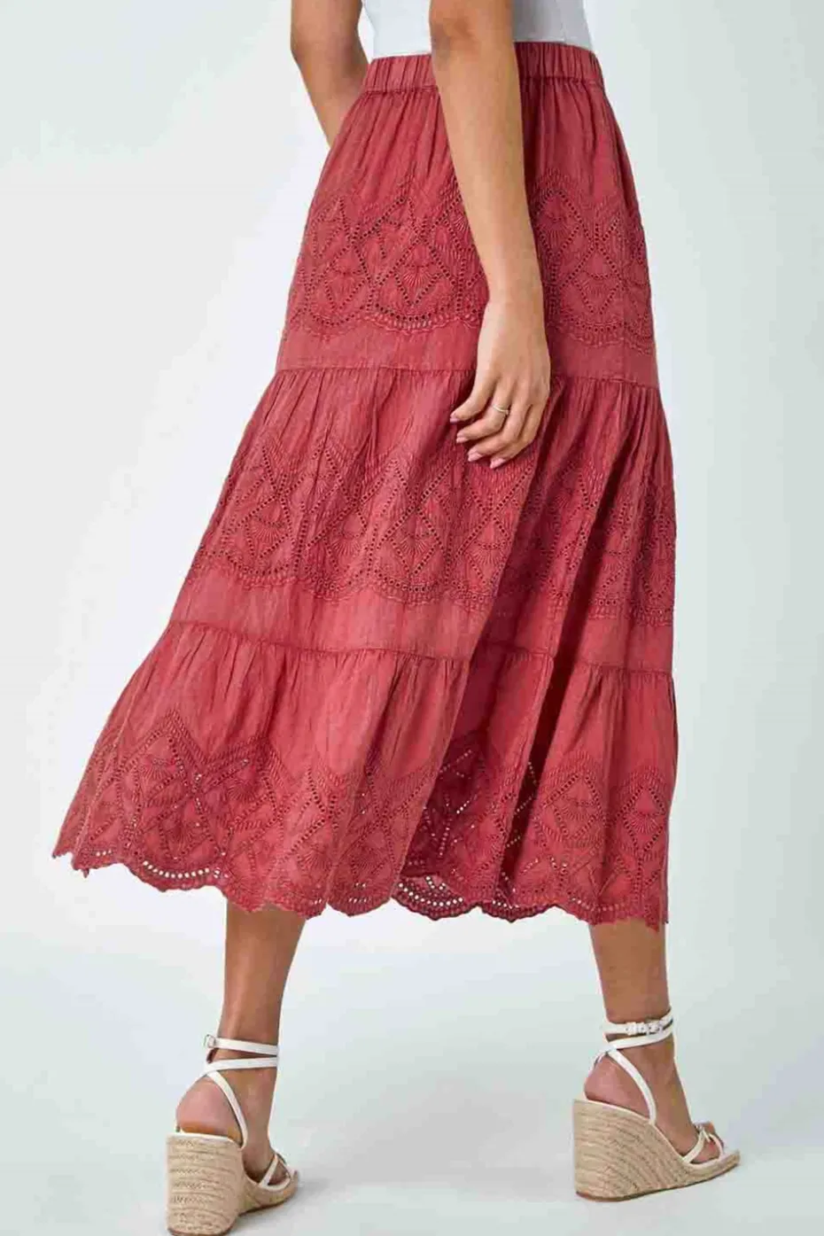 Broderie Elastic Waist A Line Tiered Midi Skirt from Roman. Broderie fabrics let you know that Summer is upon is and this skirt is no exception! Cut and fully lined with a cooling cotton fabric, this midi skirt features intricate broderie detailing in an ornate, boho-inspired print. Designed in a tiered silhouette, this floaty skirt is the ideal piece for the warmer weather. Pair with sandals and a cami for a stylish seaside style!