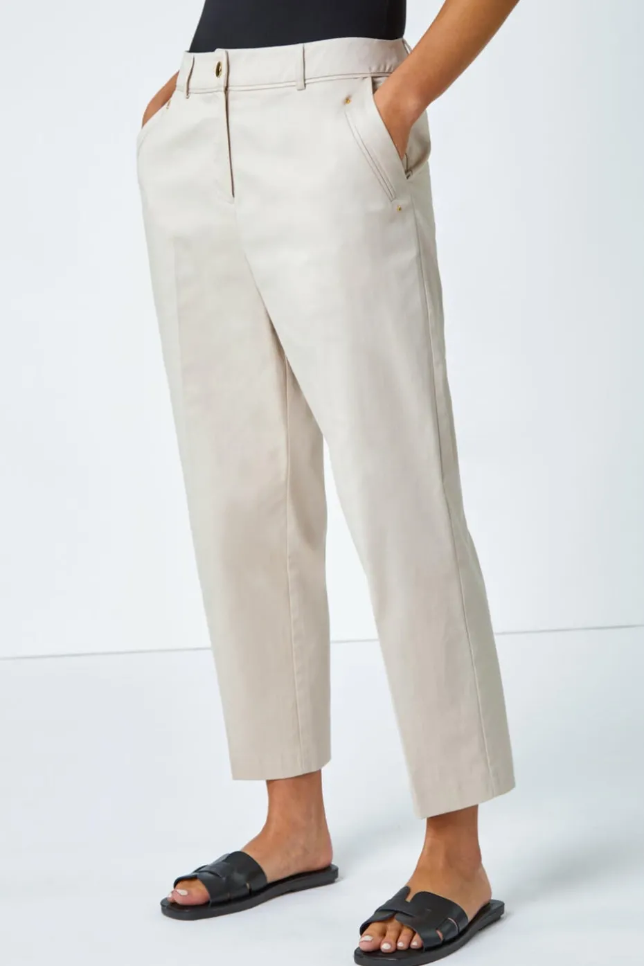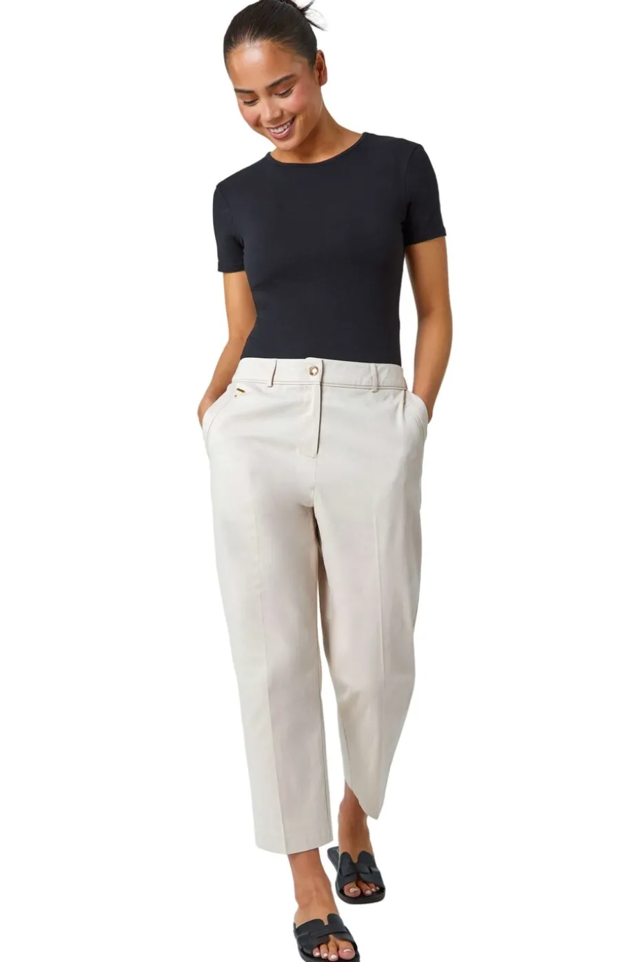 Petite Cotton Ankle Grazer Tapered Trousers from Roman. Feel fabulous this season wearing our new Petite tapered style trousers! Featuring functional pockets and classic button and zip fastening, these classic trousers are the perfect seasonal staple. Sitting at a flattering ankle length, these soft woven trousers are ideal for the warmer weather. Wear a simple white shirt and jacket for a trendy Spring outfit!