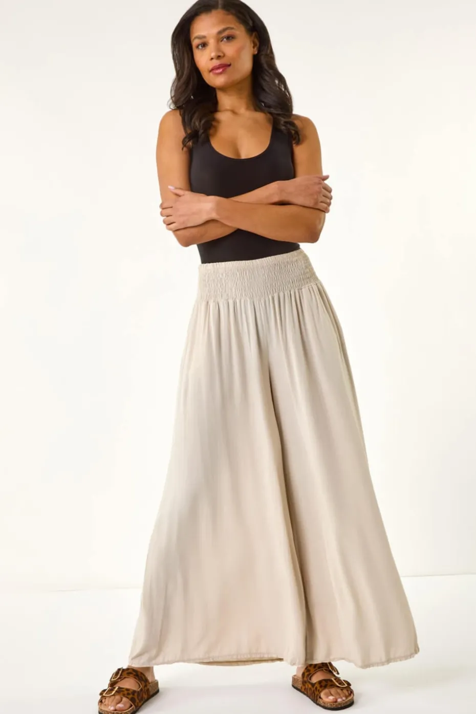 Relaxed Ruched Wide Leg Trouser from Roman. This style is ONE size. The relaxed wide trousers feature a comfortable ruched elasticated waist, offering an easy pull-on style for ultimate convenience and comfort. With a wide leg design, these trousers provide a relaxed, laid-back fit that is perfect for casual days. Pair them with a simple top and sandals for a chic and effortless look this Spring and Summer.