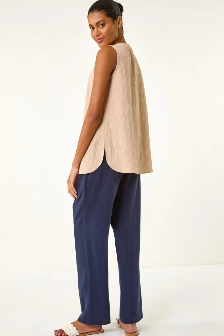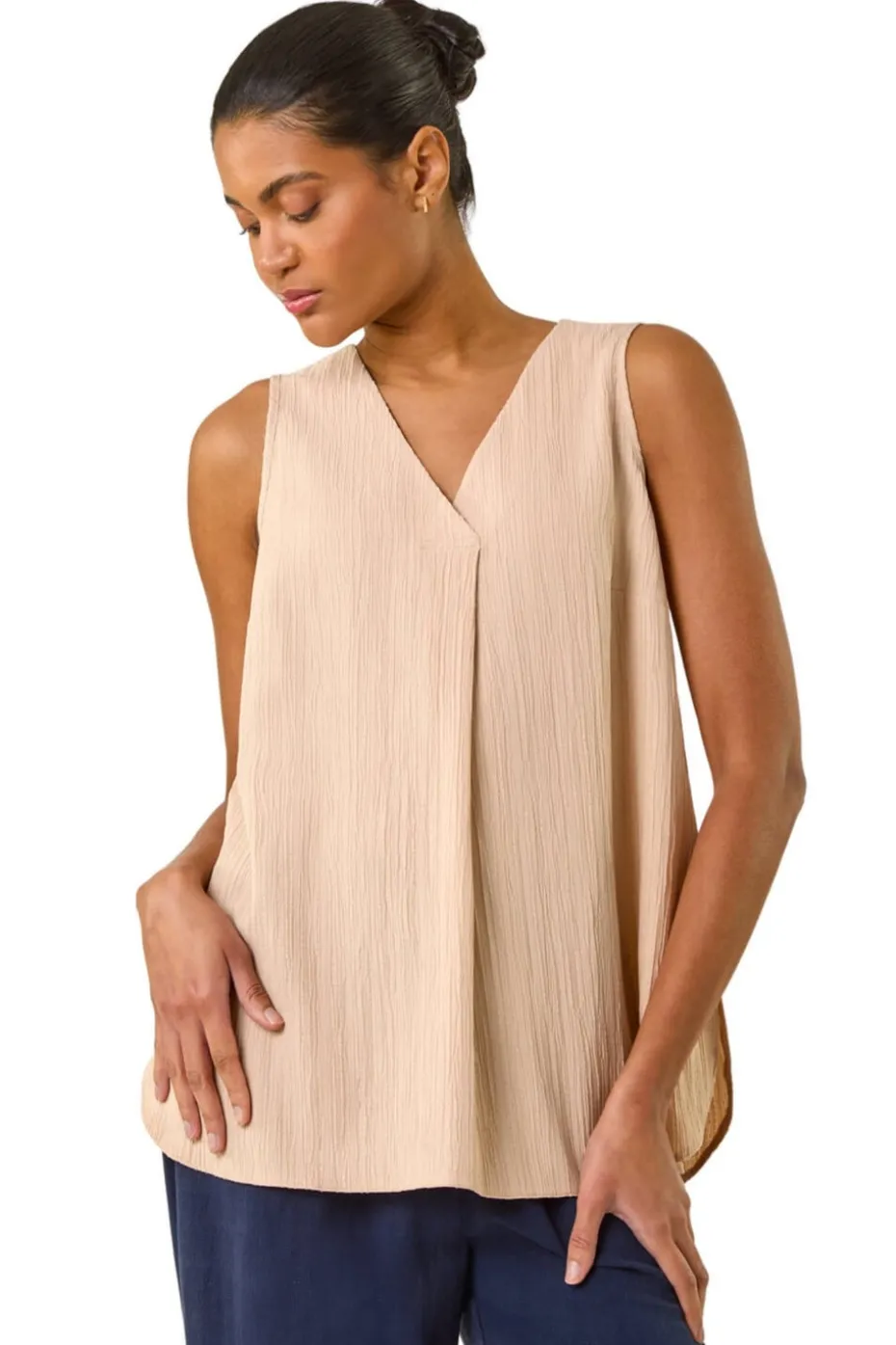 Textured Pleat Front Vest Top from Roman. Add a touch of chic sophistication to your Spring/Summer wardrobe with this elegant v-neck sleeveless top. The front pleat detail adds an interesting twist to the textured fabric, making it a stylish choice for any occasion. Pair it with your favourite jeans and sandals for a casual yet polished look that will take you from day to night effortlessly.