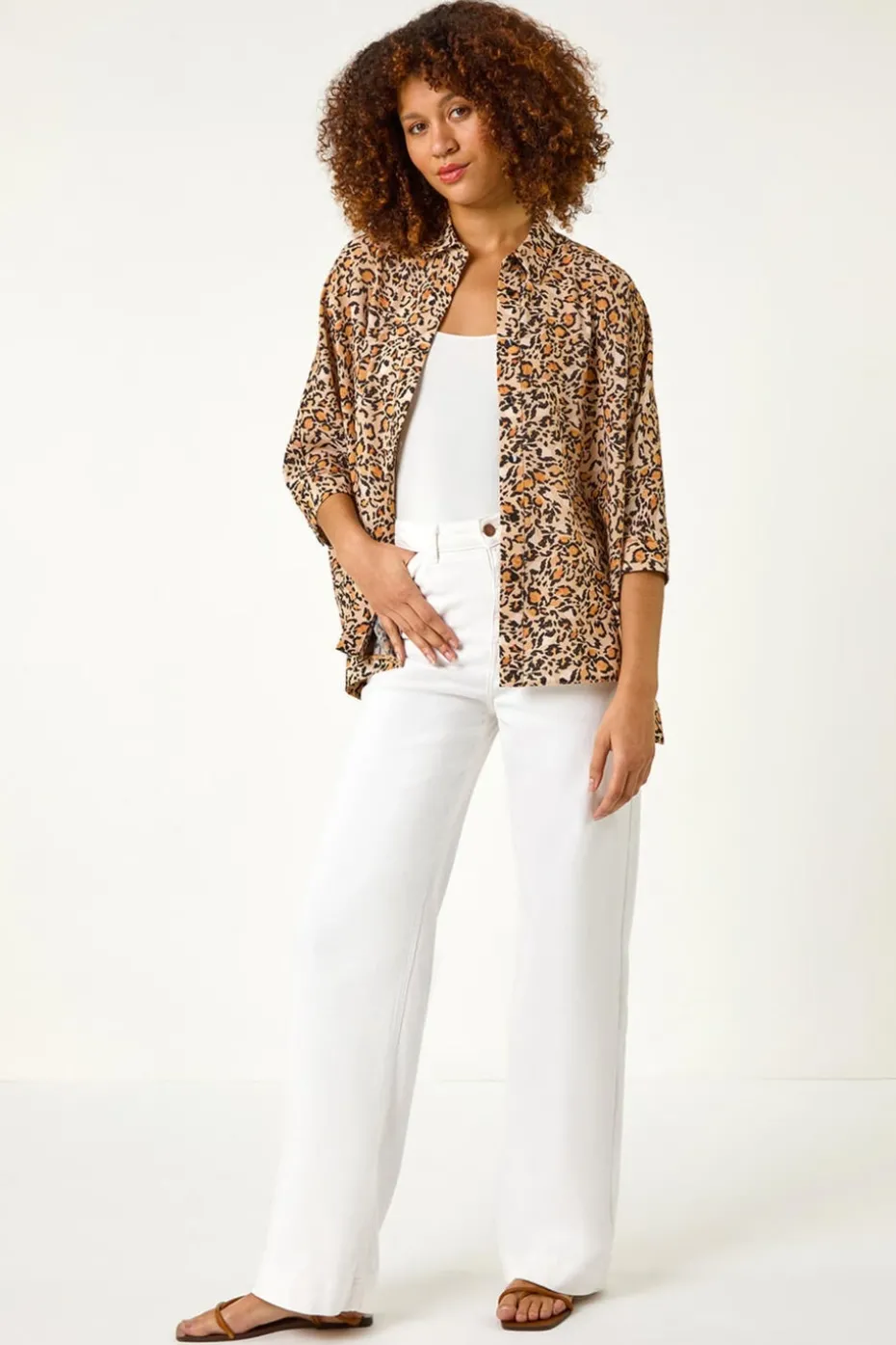 Animal Print Relaxed Blouse from Roman. Unleash your wild side this Spring Summer in this relaxed animal print blouse. Featuring a fun front button detail and collar with revers, this piece is perfect for adding some flair to your wardrobe. Crafted from a stretch woven fabric, this top has 3/4 tabbed sleeves and fierce animal print, all cut in a flattering relaxed shirt shape. Pair with jeggings and your favourite top for a stylish look!