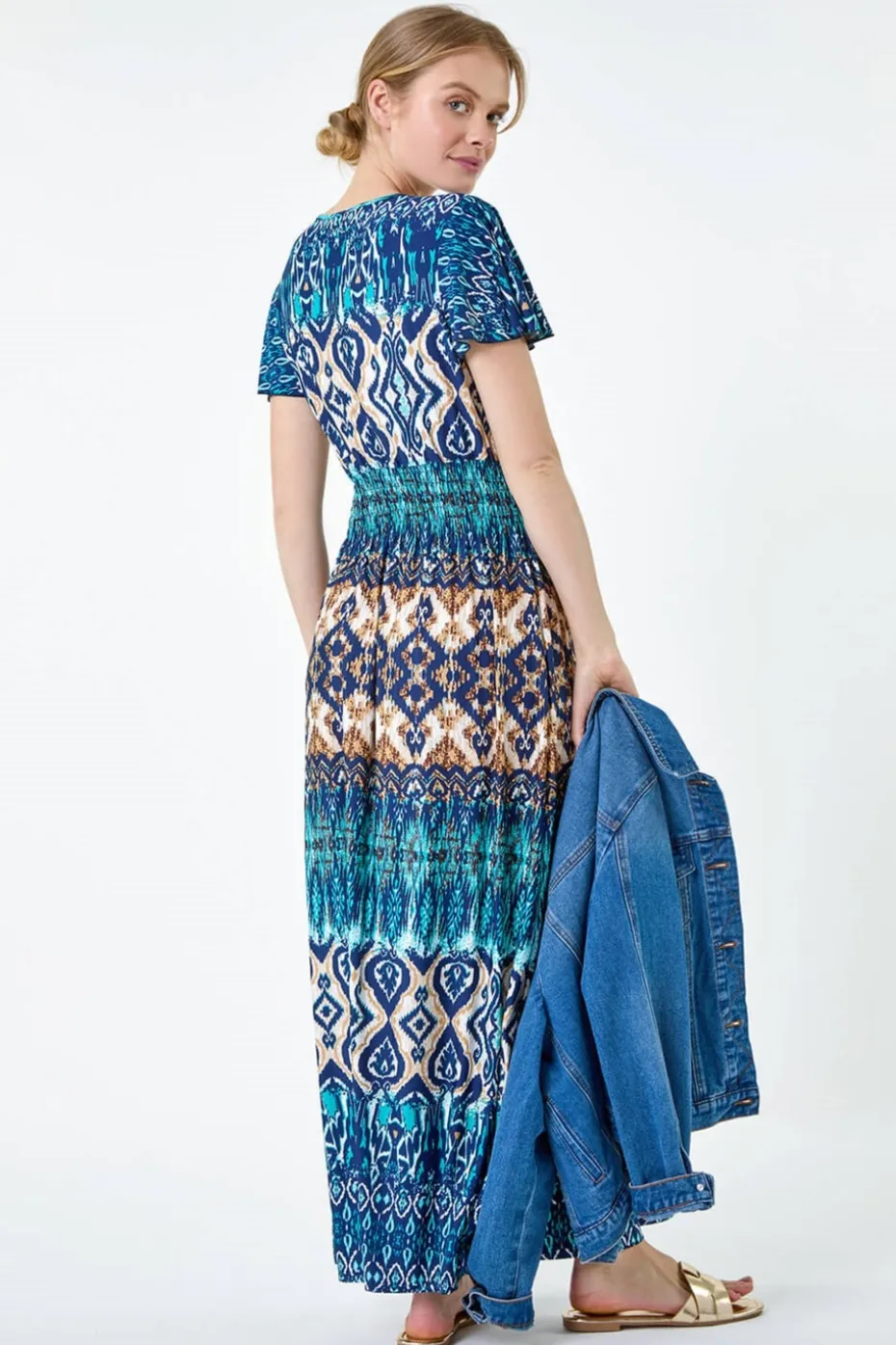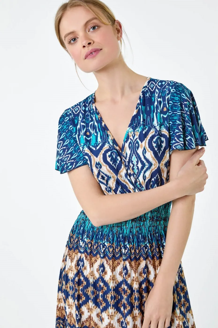 Aztec Print Shirred Stretch Maxi Dress from Roman. Add some boho prints to your wardrobe this season with our stunning aztec print design. Created in a maxi length with a wrap front, feminine v-neckline and mixed abstract print, this dress adds a feminine edge to your Summer collection. This short sleeve dress has a flattering silhouette with a stretchy shirred waist, making it so easy to pull on over the head. Pair with a strappy sandal for an effortless Summer daytime style or dress it up with wedges and a clutch for your holiday wardrobe.
