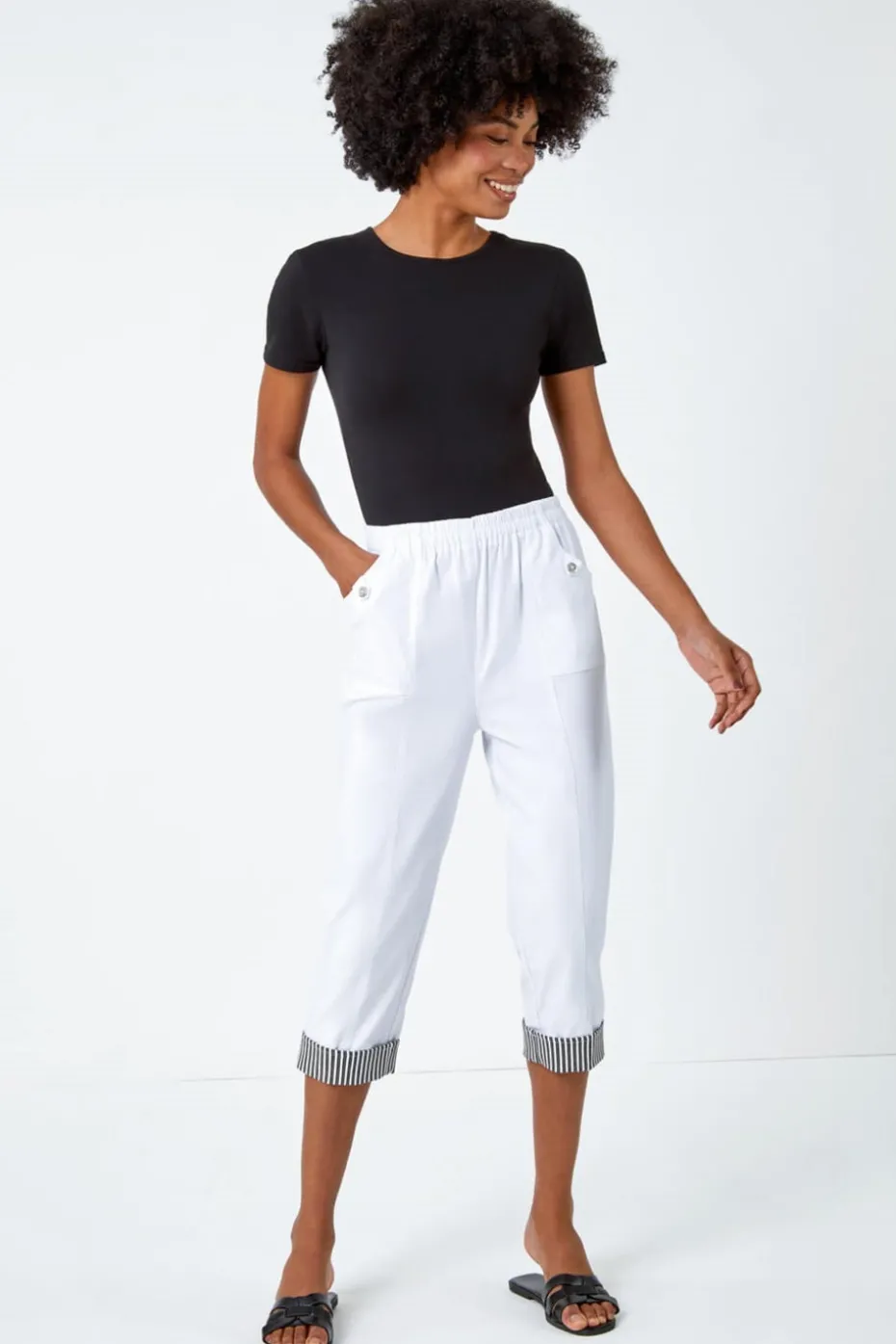 Contrast Detail Cropped Stretch Trouser from Roman. These cropped stretch trousers are perfect for the warmer weather with their comfortable elasticated waistband. Cut from a cool stretch fabric these trousers are designed in a cropped style and finished with contrasting stitch details for added interest. Pair with t shirts and sandals for a casual Summer look!