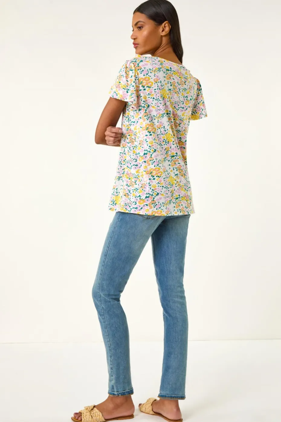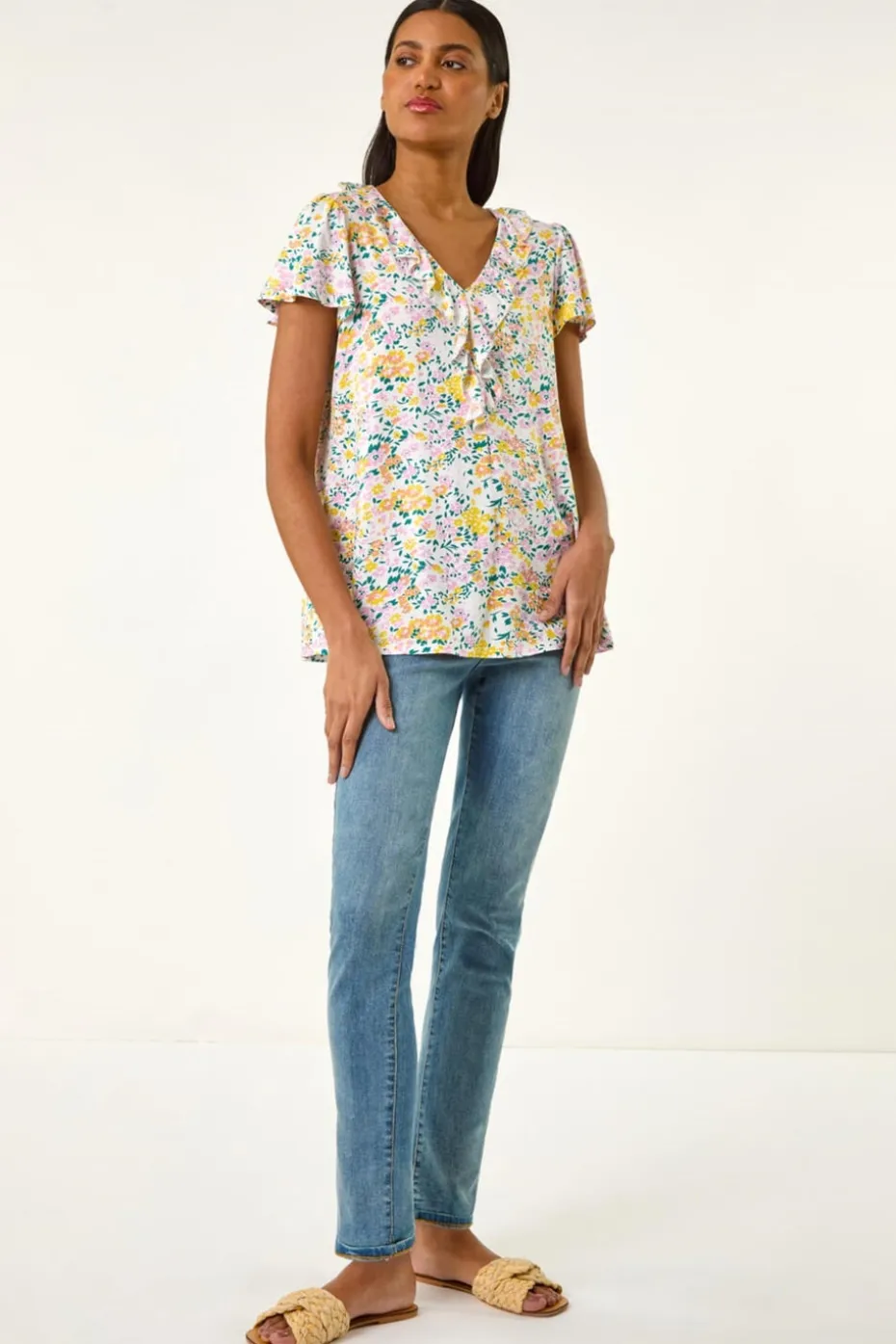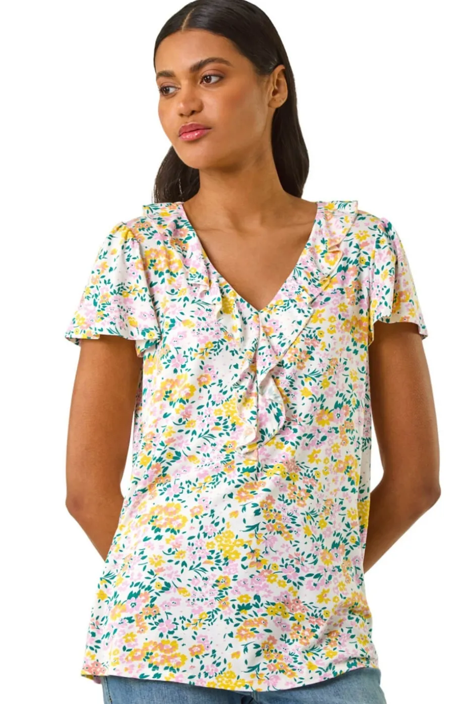 Printed Ruffle V-Neck Stretch Top from Roman. This stylish v-neck top features delicate ruffle detailing along the neckline and centre front, adding a touch of feminine charm. With short sleeves and a flattering hip-length fit, it’s made from soft stretch jersey viscose fabric for a comfortable, breathable feel. Ideal for casual wear, this top pairs effortlessly with jeans or skirts for a relaxed look. Perfect for your Spring and Summer wardrobe!
