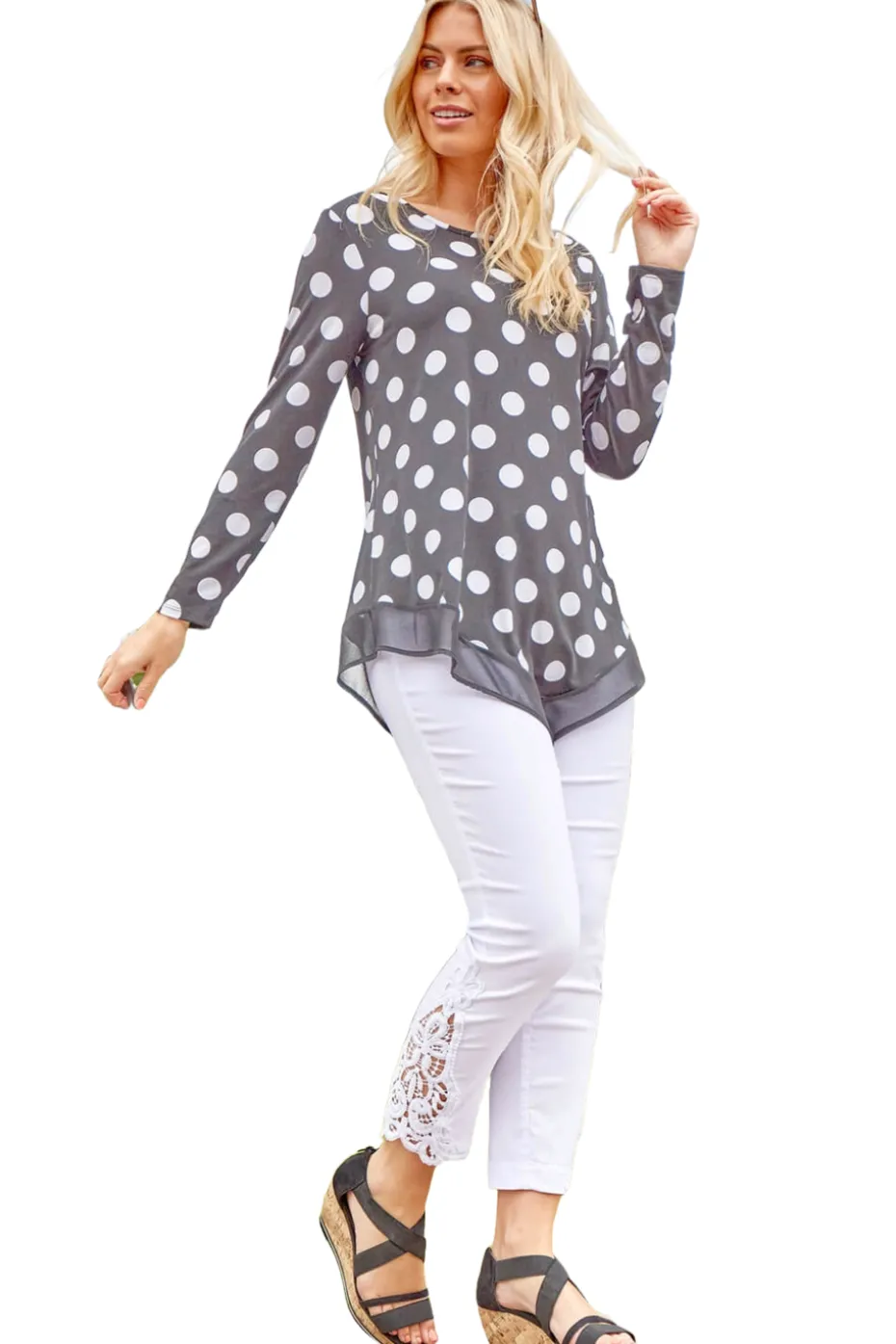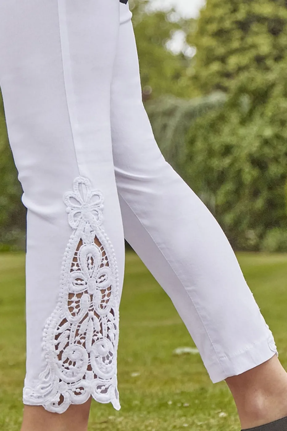 Lace Insert Elastic Waist Crop Trousers from Roman. Give your everyday looks a feminine flair. Finished with a pretty lace insert at the hem, these slim fit trousers made with soft stretch fabric are perfect for both work and special occasions. Style with a blouse and heels for a look that will take you from the office to the bar with ease.