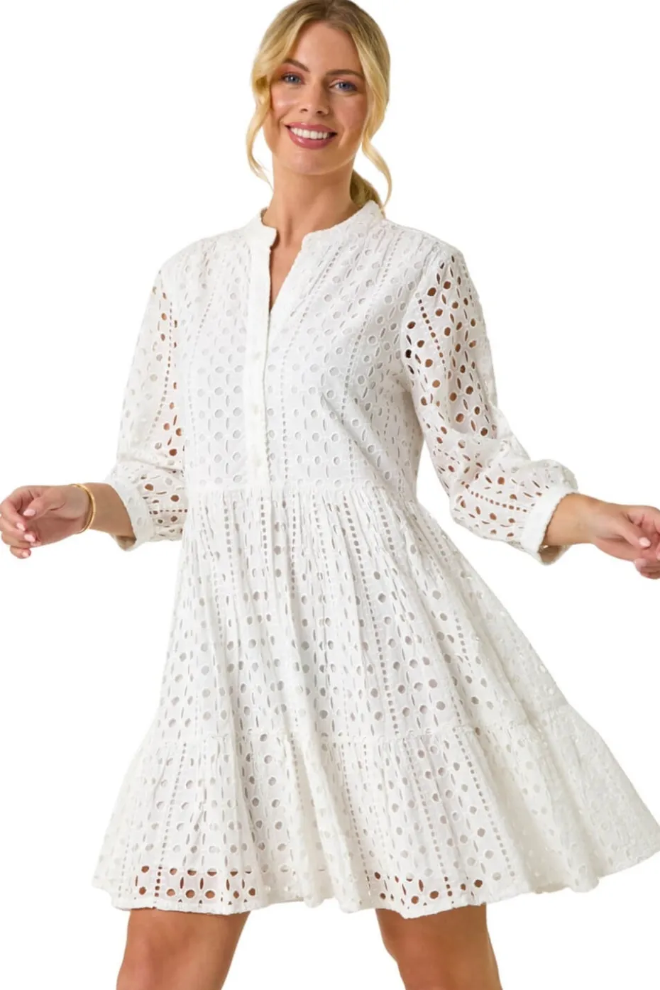 Petite Broderie Tiered Dress from Roman. Get ready for sunny days in this charming broderie dress. Featuring a flattering v-neck with button fastening on the front of the bodice, this dress boasts comfortable woven fabric and stylish 3/4 sleeves. The tiered skirt style falls beautifully at knee length for an effortless look. Perfectly paired with sandals and a denim jacket, this dress is a must-have for your Spring/Summer wardrobe!